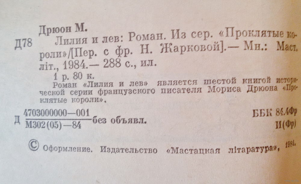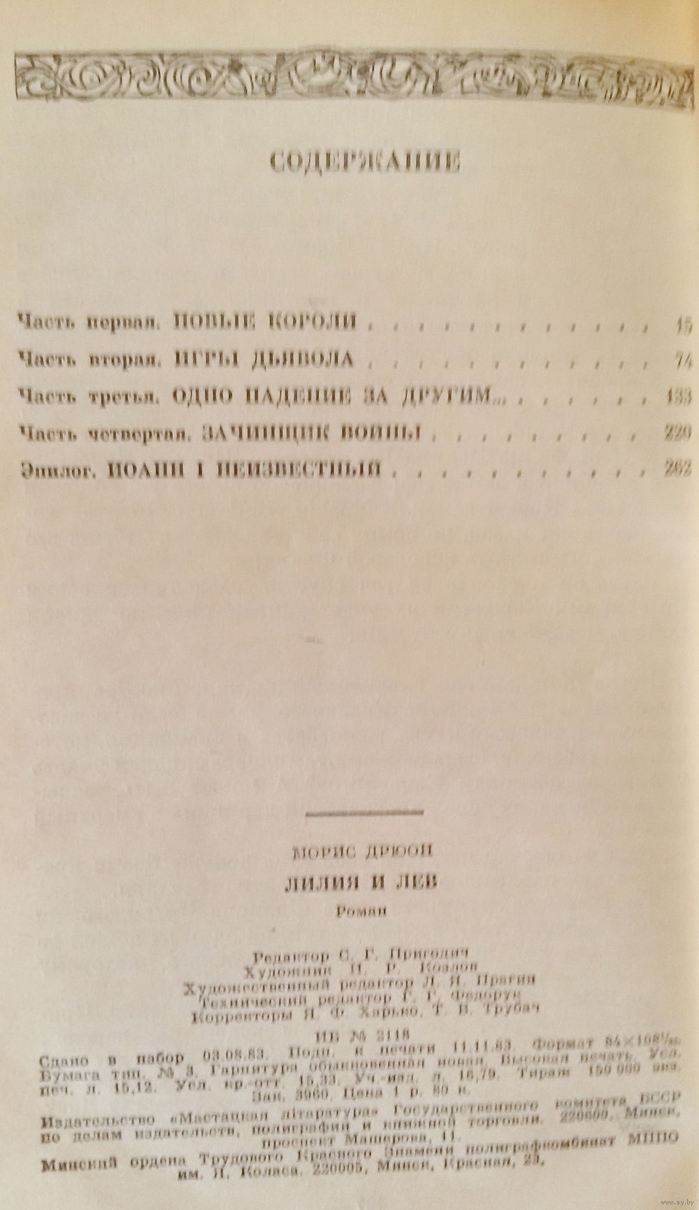 Морис Дрюон-Лилия и Лев, роман из серии «Проклятые короли», Минск, Мастацкая литература, 1984г, тираж 150.000экз, мягкий переплет.