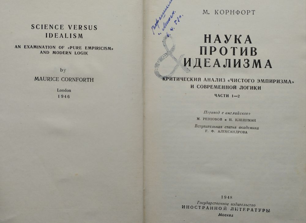 336 стр. Автор настоящей книги, английский философ-марксист Морис Корнфорт, стал известен русскоязычным читателям благодаря переводам некоторых его работ. Среди них – "Диалектический материализм. Введение" и "Открытая философия и открытое общество". "Наука против идеализма" (1948) – одно из лучших в западно-европейской философской литературе произведений, в котором дана обстоятельная и глубокая критика современных течений философского идеализма.