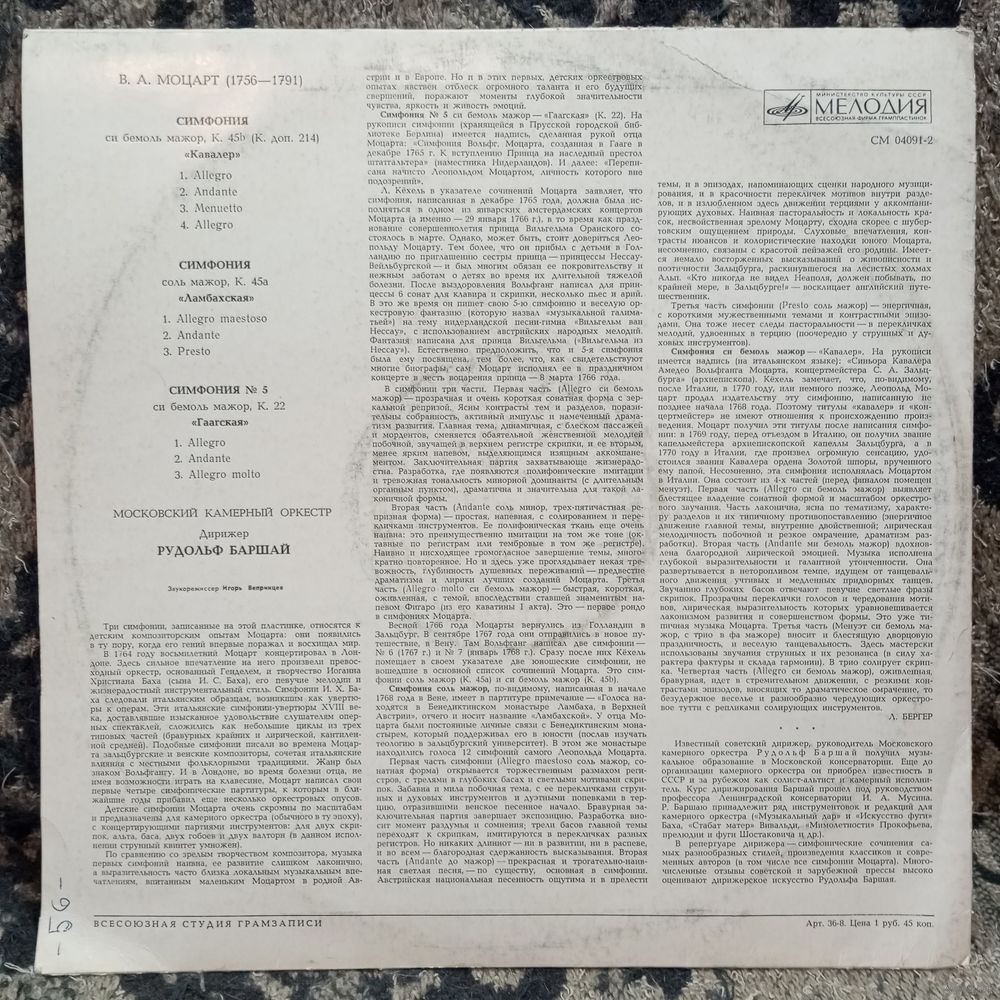 Московский камерный оркестр, дир. Рудольф Баршай - В. Моцарт. Симфония "Кавалер". Симфония "Ламбахская". Симфония "Гаагская" - ВСГ, 1968 г.