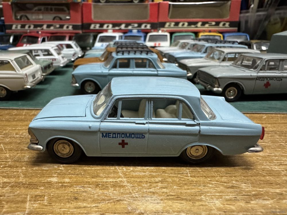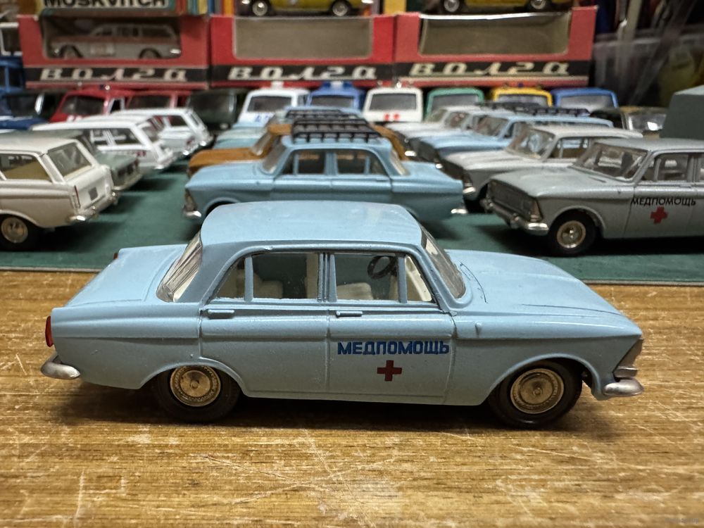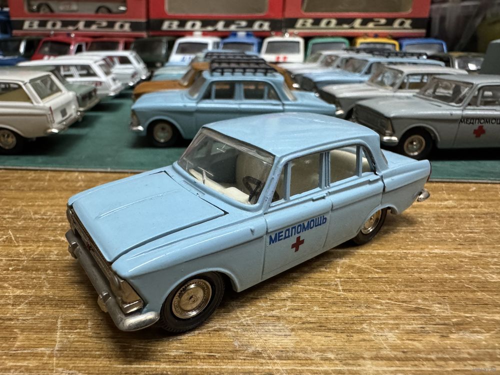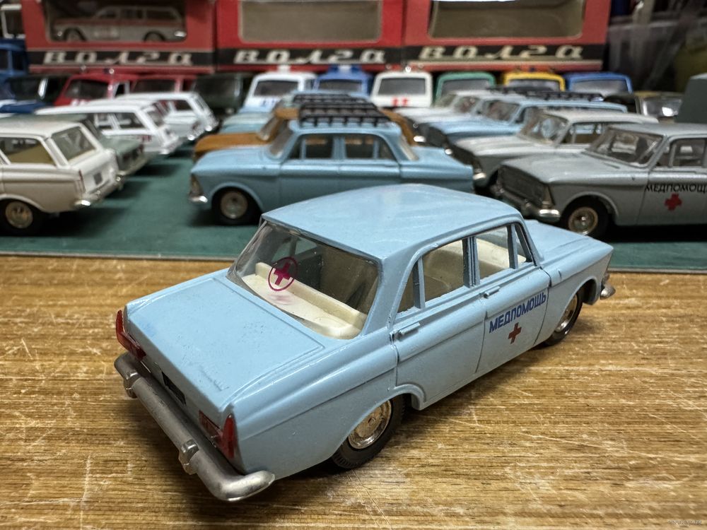 Москвич 408 Медпомощь, номерной А1, ранняя решетка с двумя рифлеными круглыми фарами. Классический светло-голубой цвет.