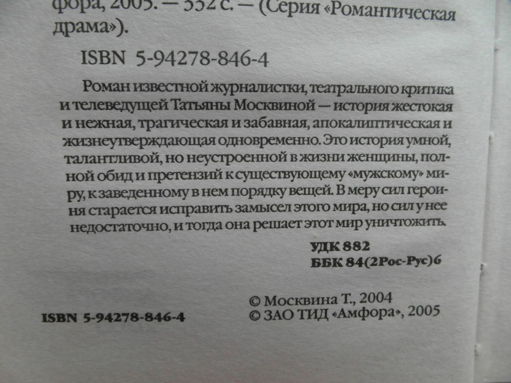 Роман известной журналистки, театрального критика и телеведущей Татьяны Москвиной - история жестокая и нежная, трагическая и забавная, апокалиптическая и жизнеутверждающая одновременно. Это история умной, талантливой, но неустроенной в жизни женщины, полной обид и претензий к существующему `мужскому` миру, к заведенному в нем порядку вещей. В меру сил героиня старается исправить замысел этого мира, но сил у нее достаточно, и тогда она решает этот мир уничтожить. `Смерть это все мужчины` - история болезни гордого духа, драматически соединенного с женской природой.