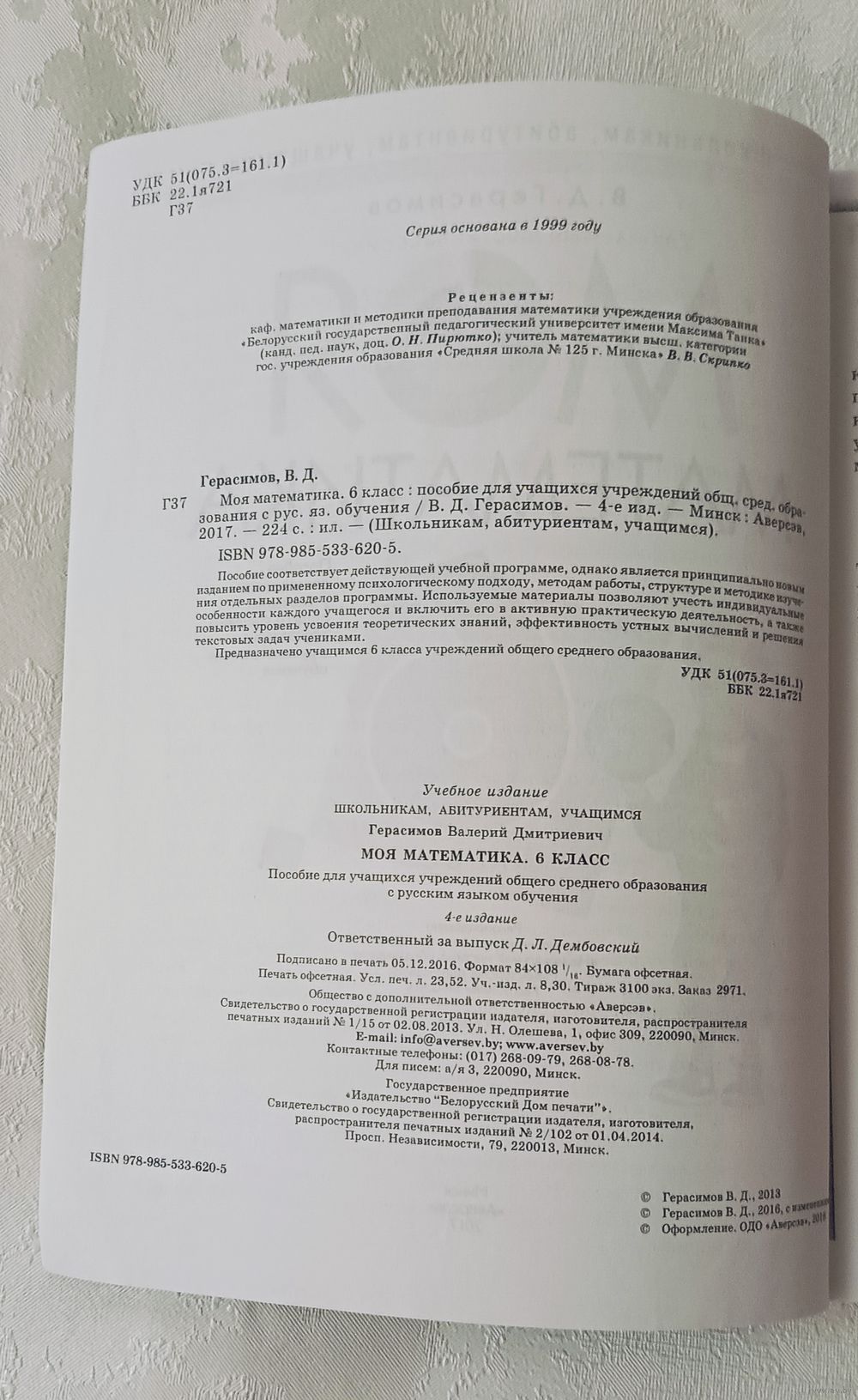 Моя математика, 6 класс: пособие для учащихся учреждений общ. сред. обра зования с рус. яз. обучения / В. Д. Герасимов. 4-е изд. — Минск: Аверса, 2017. - 224 с.: ил. (Школьникам, абитуриентам, учащимся), мягкая обложка, увеличенный формат.