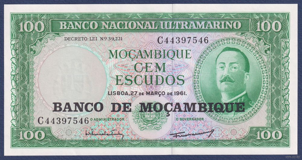Мозамбик, 100 эскудо 1961 (1976) г, P-117 (C, губернатор Айрес-де-Орнелас), UNC