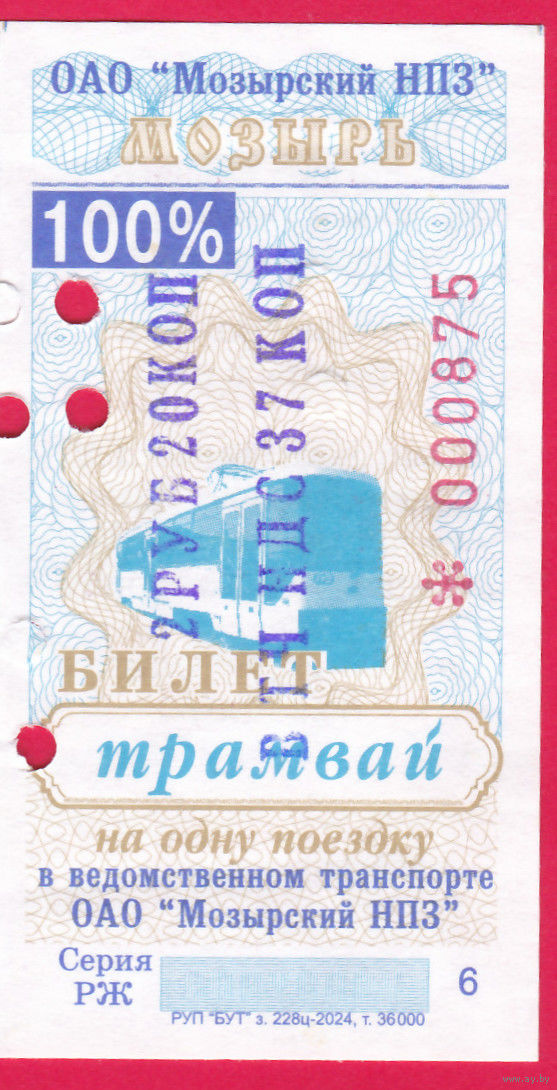Билет на проезд в трамвае до промзоны НПЗ (тариф 2,20 руб)