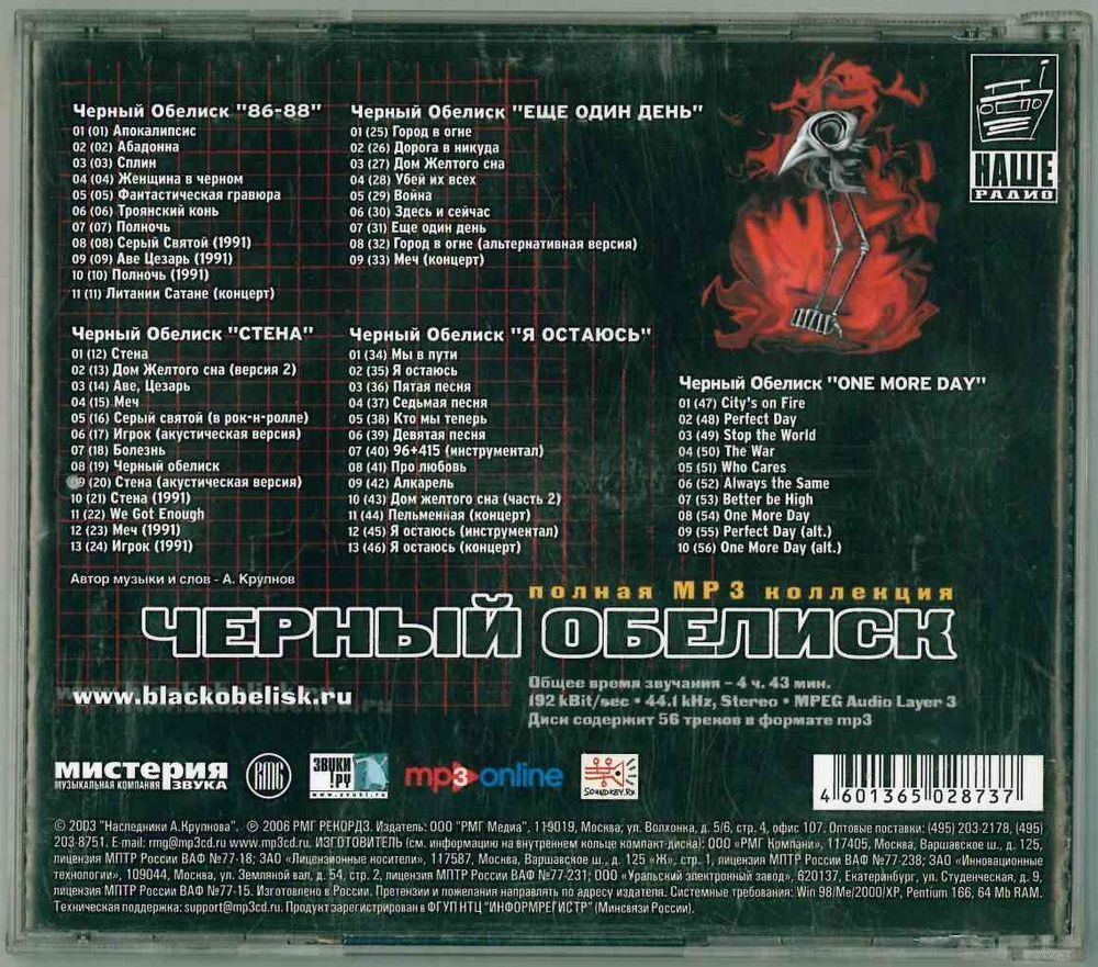 1Апокалипсис7:272Абадонна5:433Сплин5:104Женщина В Черном5:245Фантастическая Гравюра4:596Троянский Конь3:447Полночь5:558Серый Святой (1991)4:359Аве Цезарь (1991)4:0110Полночь (1991)5:1211Литании Сатане (концерт)5:11Стена12Стена3:4913Дом Желтого Сна (версия 2)4:3414Аве, Цезарь4:5715Меч8:1116Серый Святой (в рок-н-ролле)4:1517Игрок (акустическая версия)4:4818Болезнь6:0419Черный Обелиск3:5620Стена (акустическая версия)3:5821Стена (1991)4:2722We Got Enough4:5323Меч (1991)8:0924Игрок (1991)4:11Еще Один День25Город В Огне4:2626Дорога В Никуда4:5327Дом Желтого Сна4:1728Убей Их Всех5:0729Война9:0030Здесь И Сейчас5:5631Еще Один День (День прошел, а ты все жив)5:2532Город В Огне (альтернативная версия)4:4033Меч (концерт)6:45Я Остаюсь34Мы В Пути4:3135Я Остаюсь4:2636Пятая Песня4:3137Седьмая Песня4:3138Кто Мы Теперь4:5139Девятая Песня1:374096+415 (инструментал)4:4941Про любовь4:5742Алкарель2:2143Дом Желтого Сна (часть 2)7:5244Пельменная (концерт)4:1845Я остаюсь (инструментал)4:3046Я Остаюсь (концерт)4:50One More Day47City's On Fire4:4148Perfect Day4:4449Stop The World4:1350The War7:3251Who Cares5:0552Always The Same5:0653Better Be High5:1654One More Day (Day Is Gone You Still Alive)4:4155Perfect Day (alternate version)4:4456One More Day (Day Is Gone You Still Alive) (alternate version)4:41NotesОбщее время звучания - 4 ч. 43 мин.