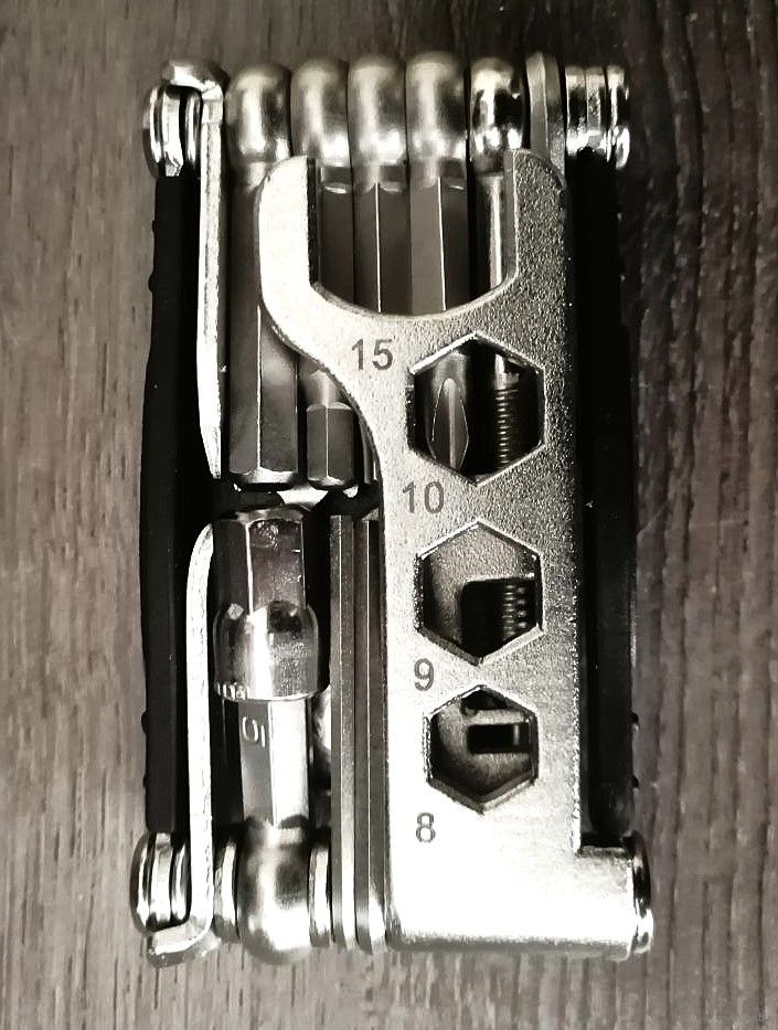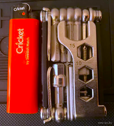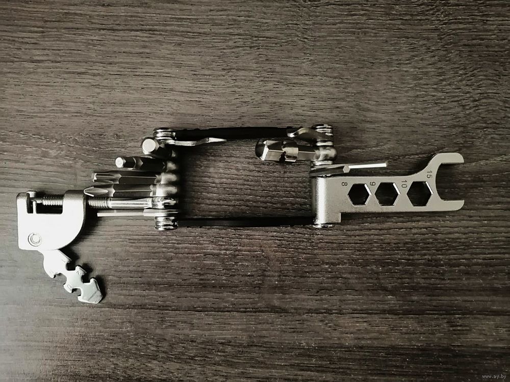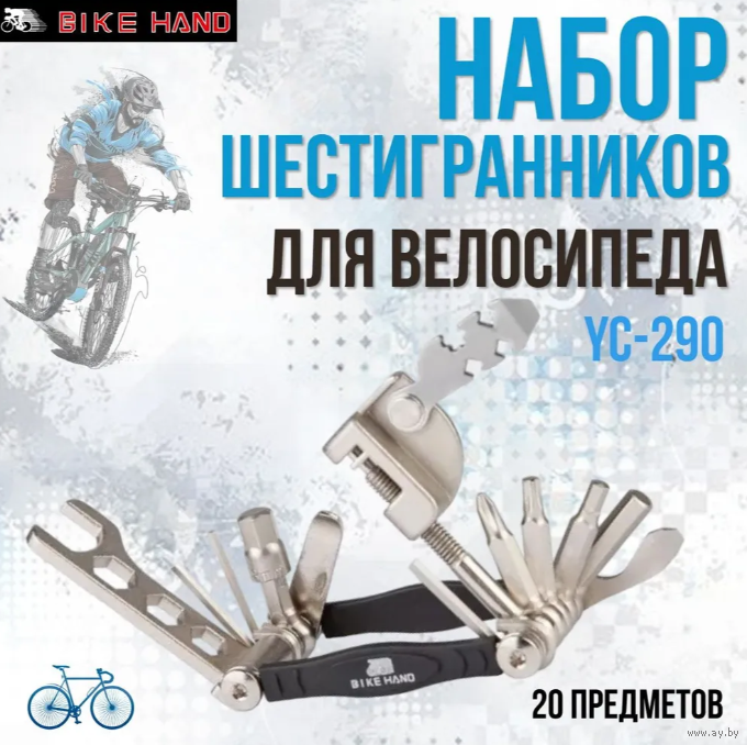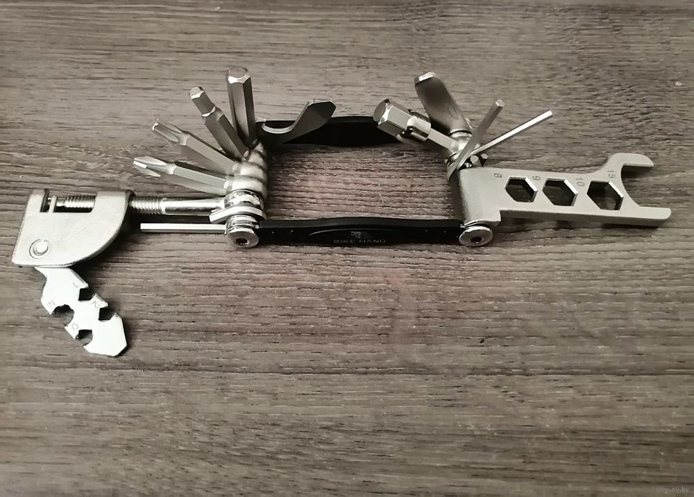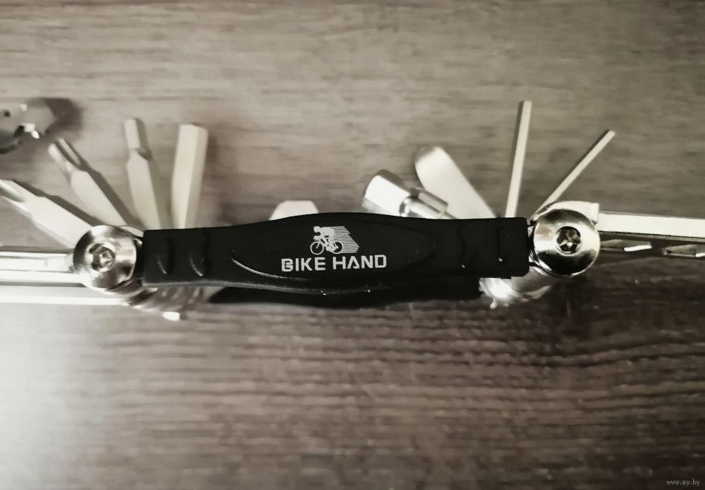 Супер-компактный мультитул BikeHand YC-290. Боковые пластины покрыты soft-touch пластиком. Hex:2;2.5;3;4;5;6;8мм. Выжимка цепи. Крестовая отвертка. Ключ Тorx 25 мм для болтов тормозных дисков. Стальная лопатка для бортировки колёс (монтажка). Накидные ключи 8,9,10мм. Рожковый ключ на 15мм. Спицевые ключи 3.2/3.3/3.5, ключи 14G/15G для Shimano и отдельный ключ для спиц Mavic. Открывашка. Прочная, высококачественная сталь
