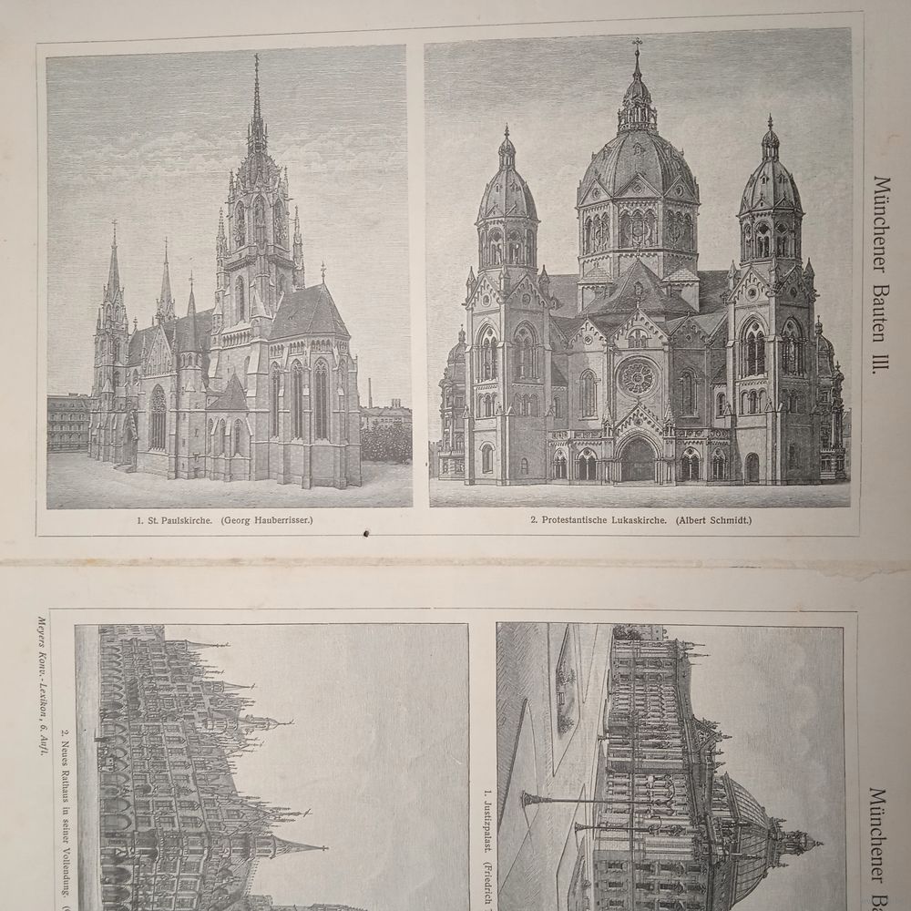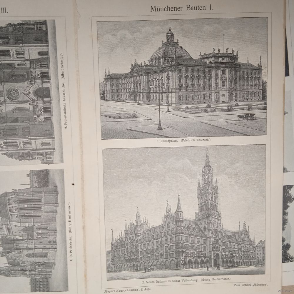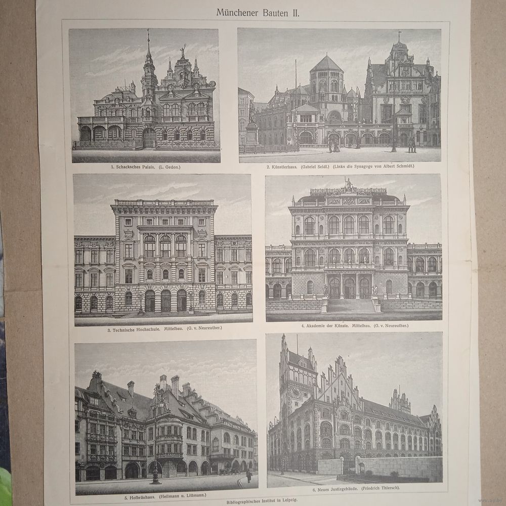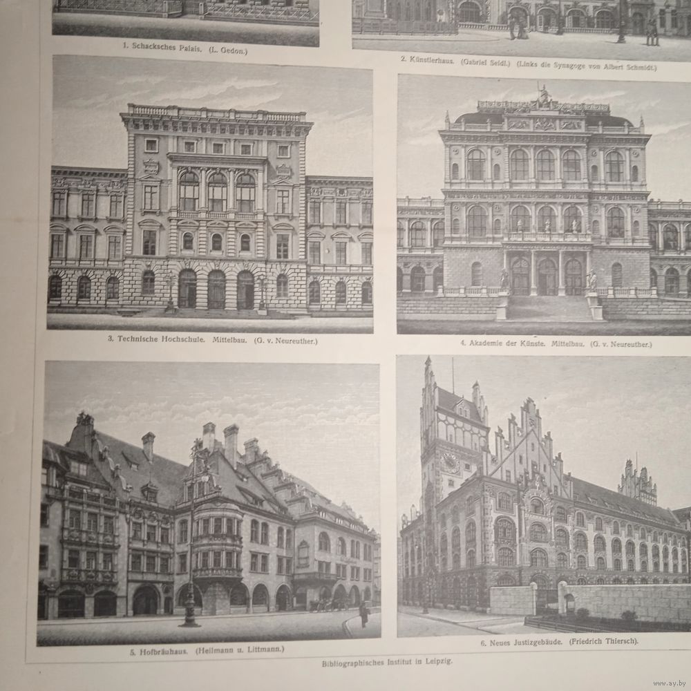 Munchener Bauten 2. Энциклопедическая гравюра конец 19в. 32х24см.