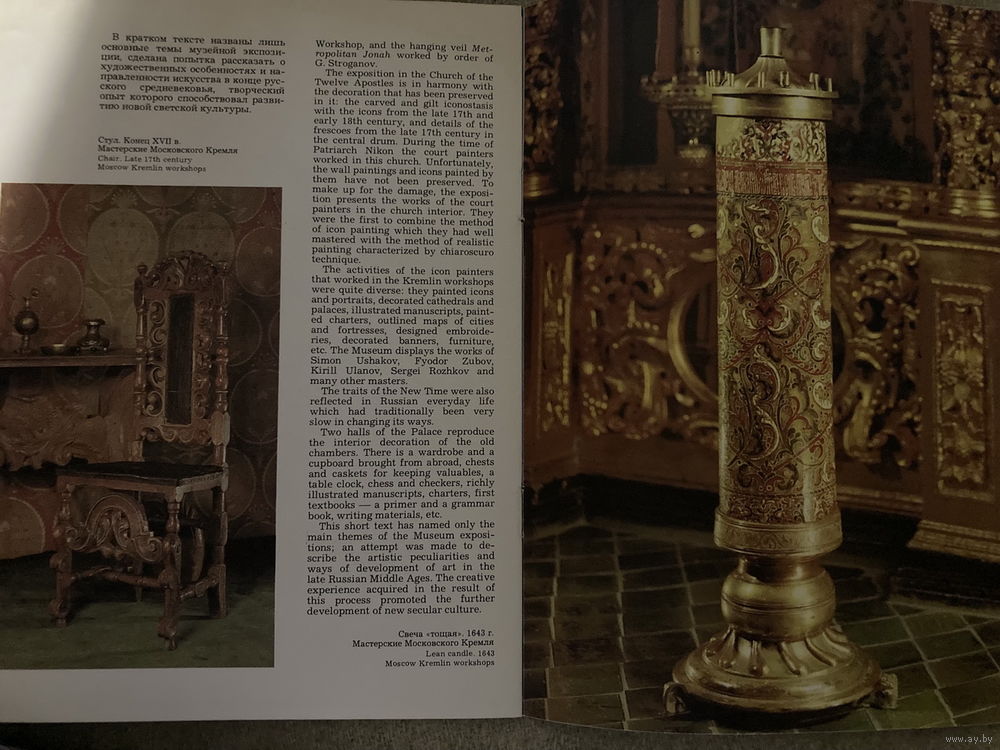 /6/ Букинистическое издание. ОПИСАНИЕ: В Музее прикладного искусства и быта России XVII века в Московском Кремле представлены некоторые виды прикладного искусства, являвшегося неотъемлемой частью древнерусской художественной культуры. Расположен музей в Патриарших палатах - памятнике гражданской архитектуры Кремля. История строительства здания, его назначение оказали влияние на содержание экспозиции и стали одной из ее тем.