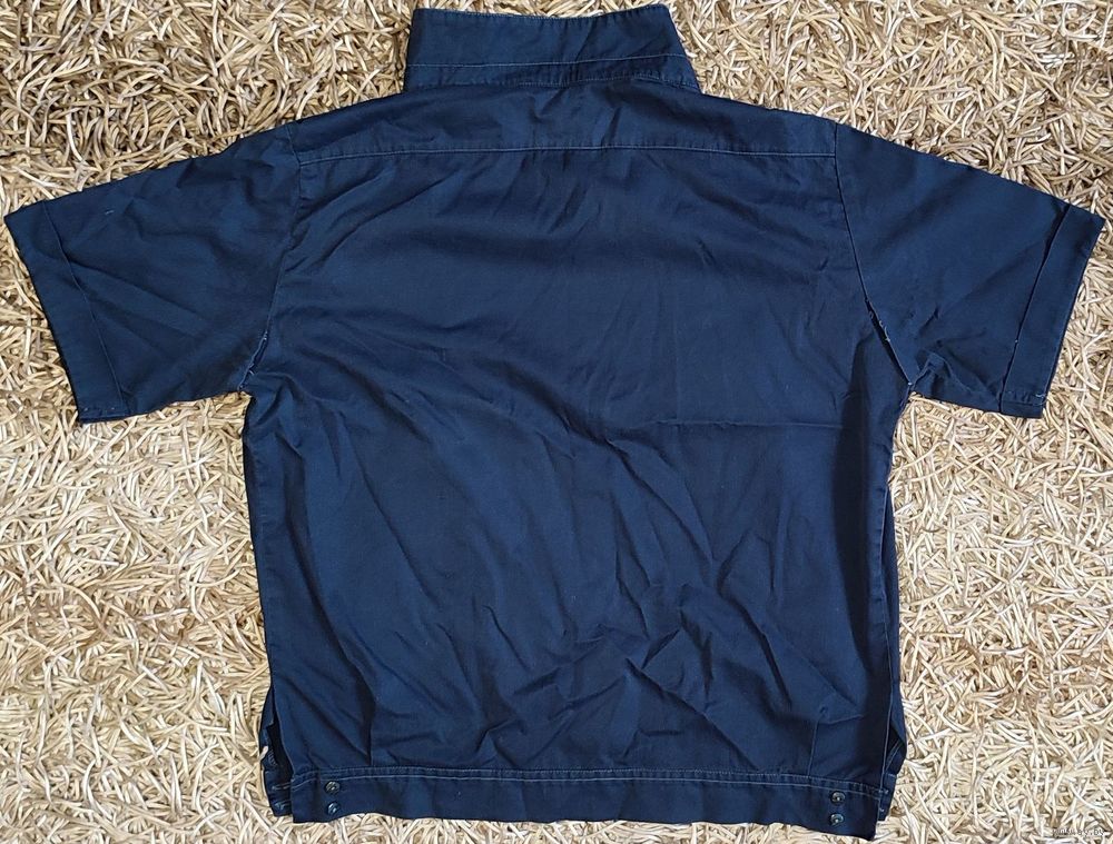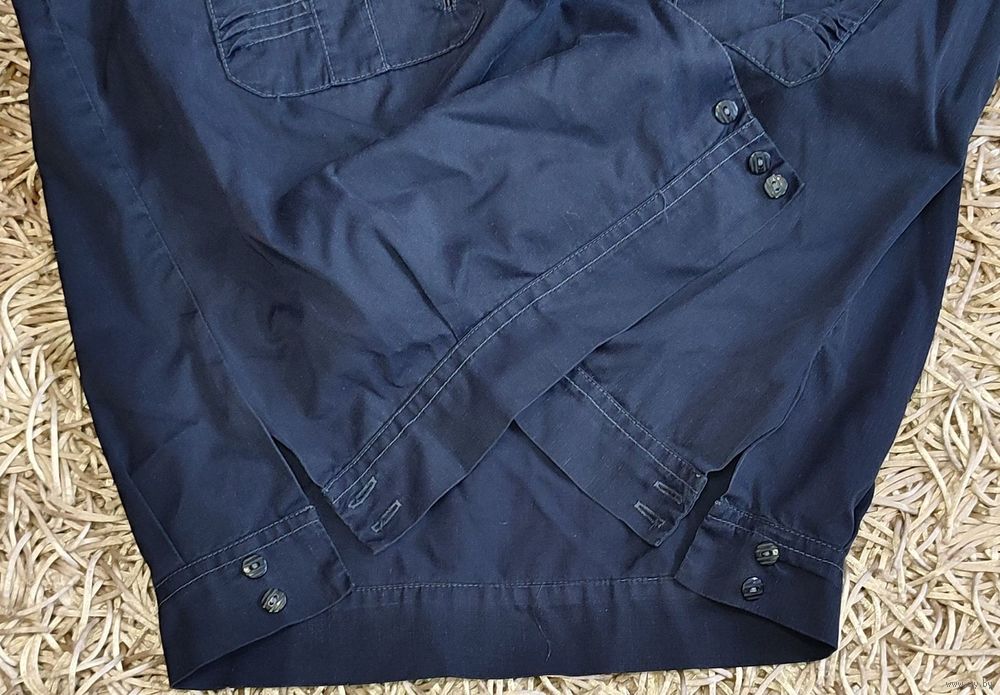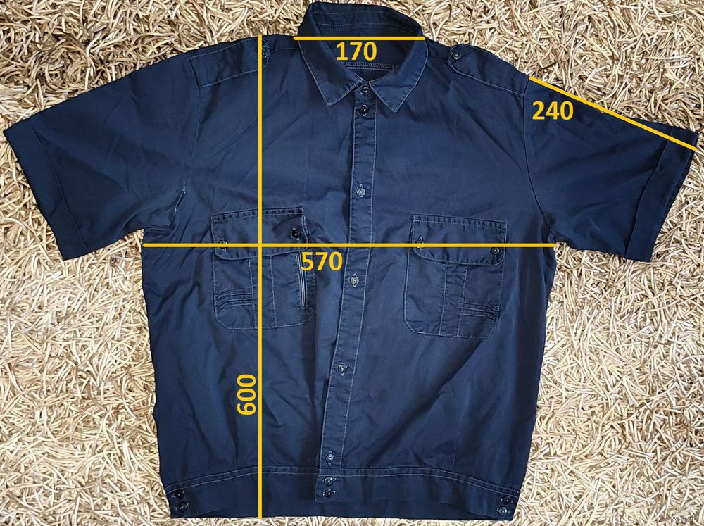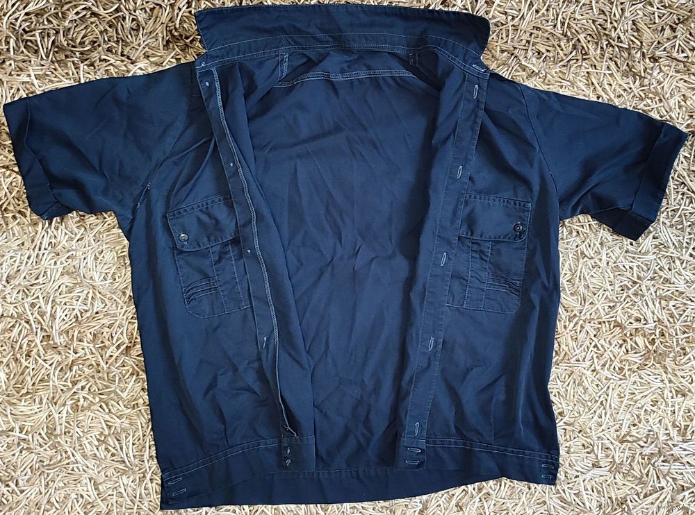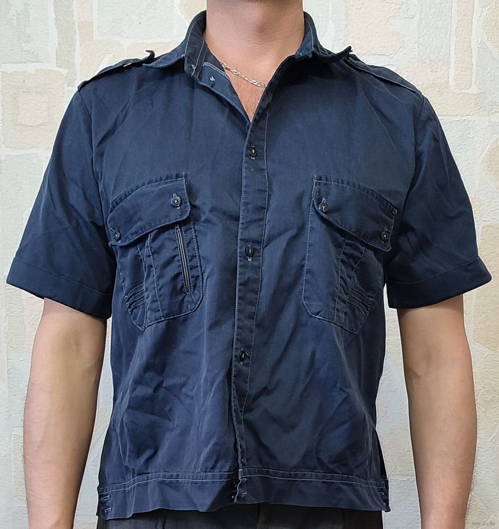 Мужская рубашка синего цвета с коротким рукавом без опознавательных знаков о производителе. Этикетки с составом не сохранилось. Покупалась в Испании в 1984-1985 годах. Рукава нуждаются в подшивке (фото №8-9), все пуговицы родные и на местах