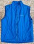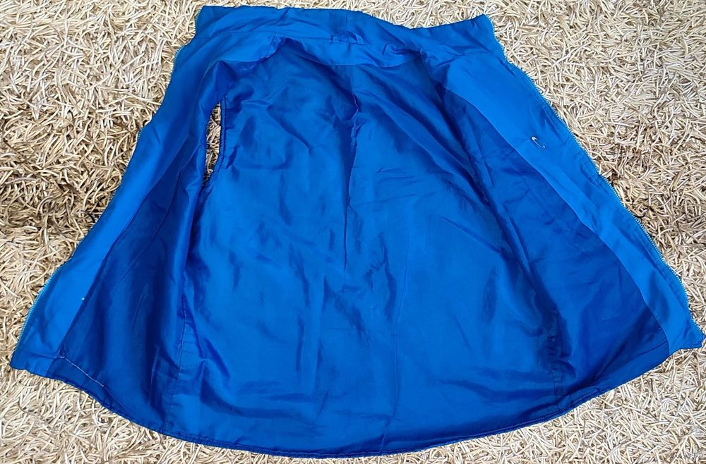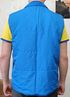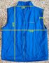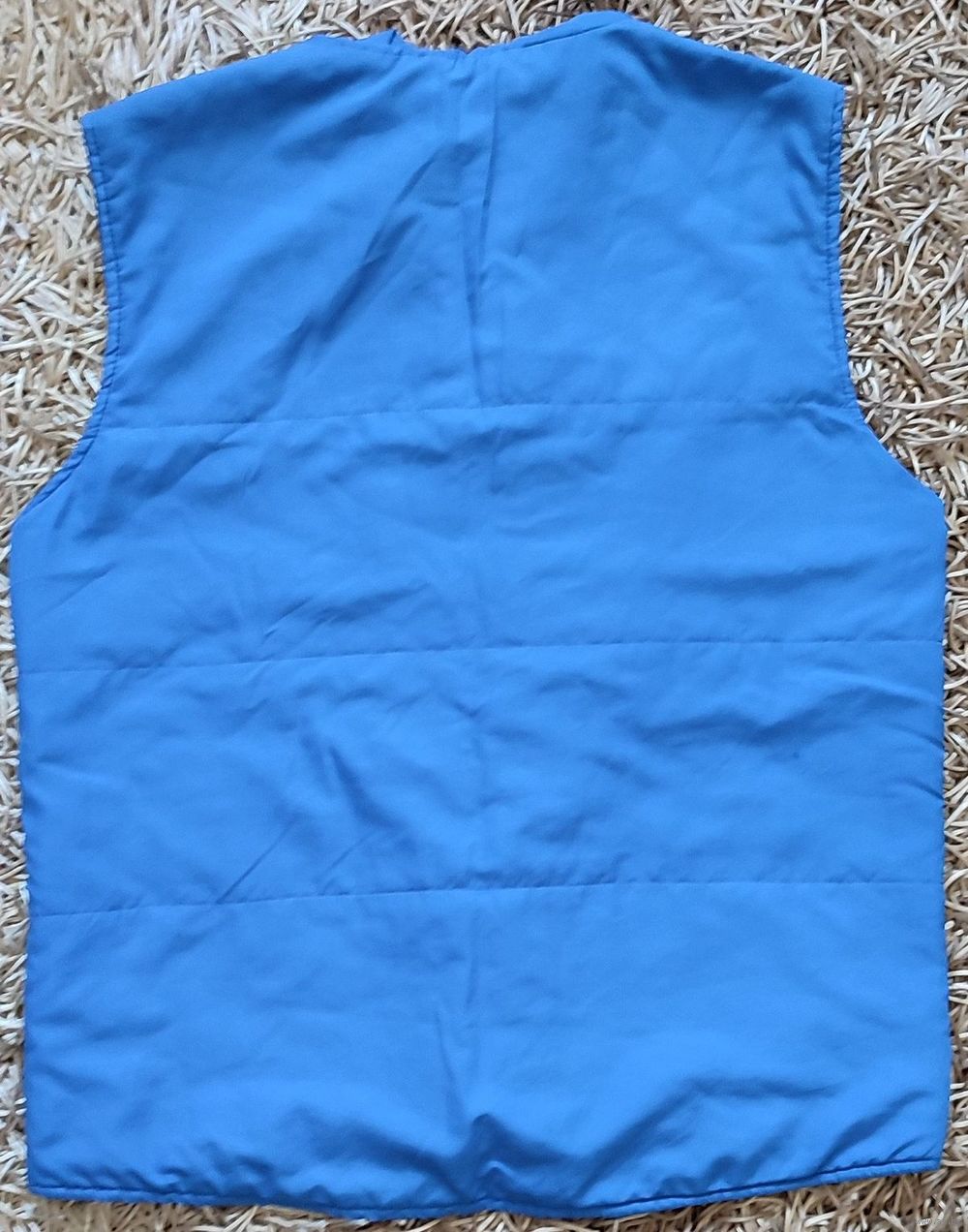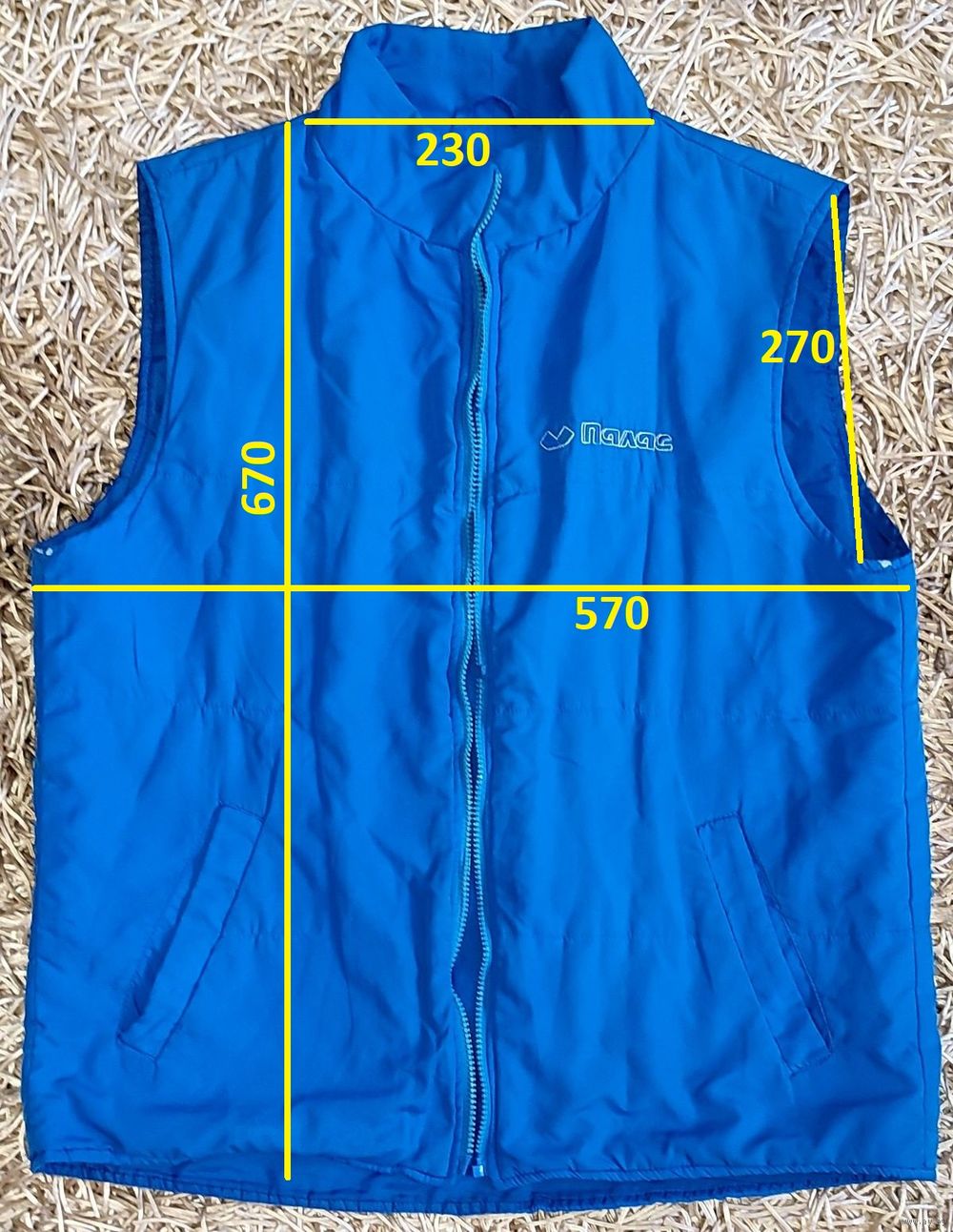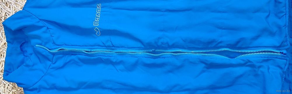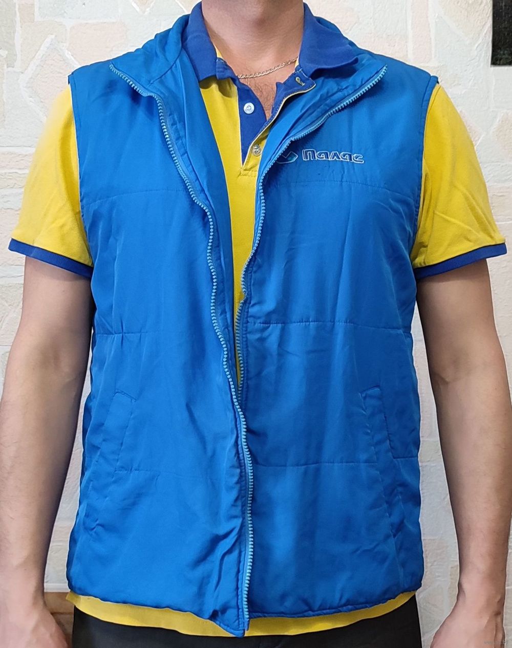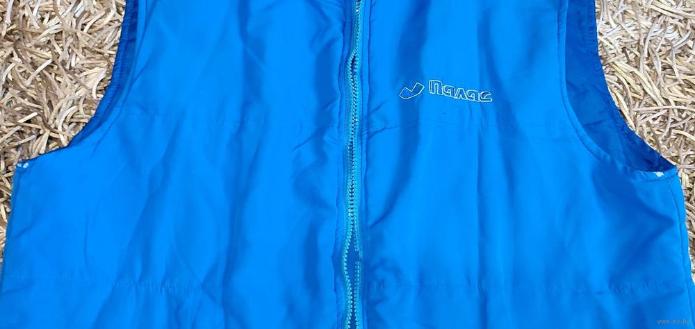 Мужская жилетка голубого цвета с карманами и логотипом торговой сети "Палас". Этикетки с составом не сохранилось. Нет собачки на замке, пару зубчиков замка, небольшие потёртости подмыхами (фото №7-8), мелкая драпинка сзади (фото №9)