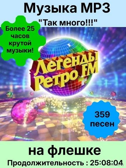 Музыка MP3 Легенды Ретро FM на флешке. Отличная импортная музыка, слушаешь и ностальгируешь о далеком прошлом. Отлично слушать в машине, не уснешь, музыка достаточно бодрая и ритмичная, хочется танцевать. Запись чёткая. Легенды Ретро FM - и этим все сказано! Рекомендую!