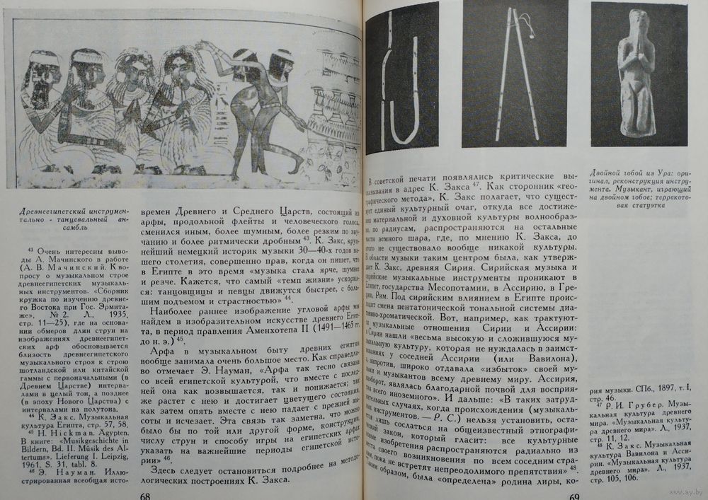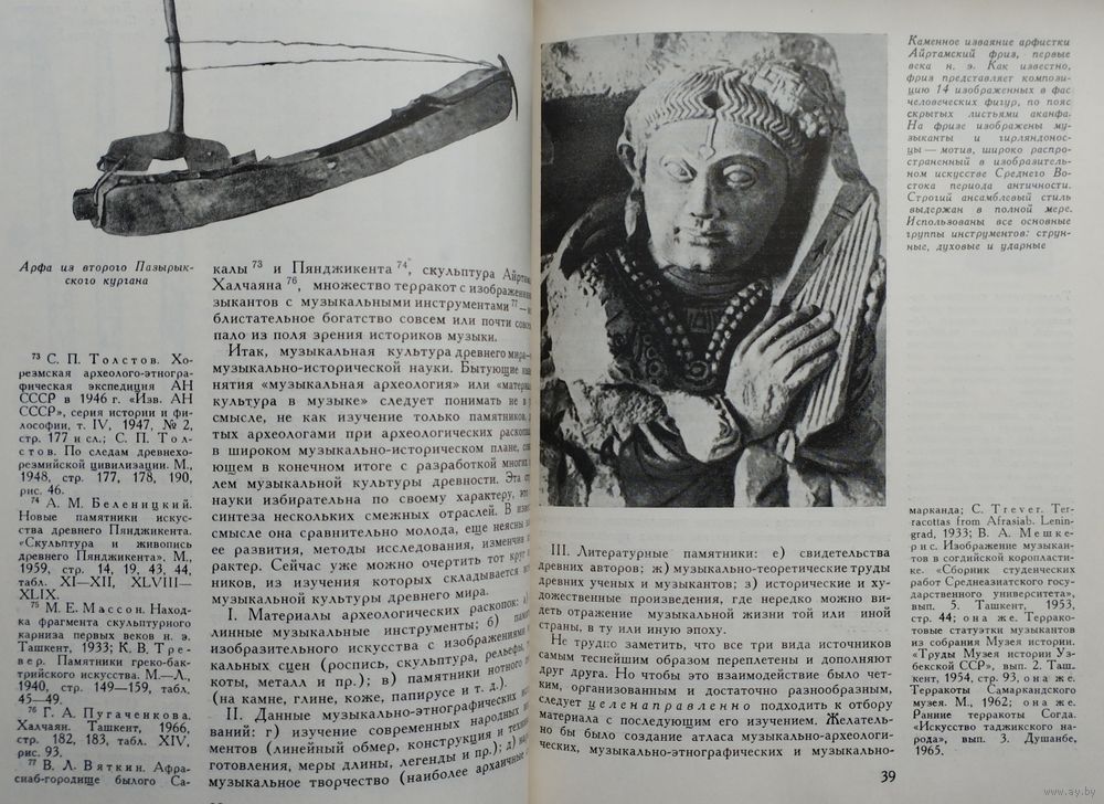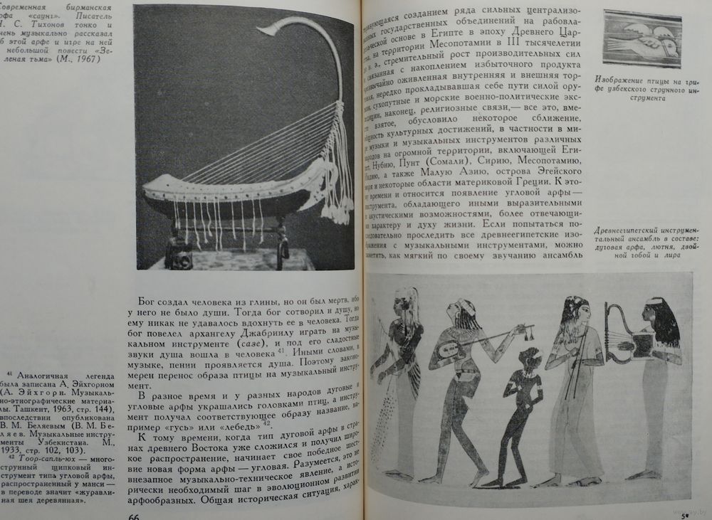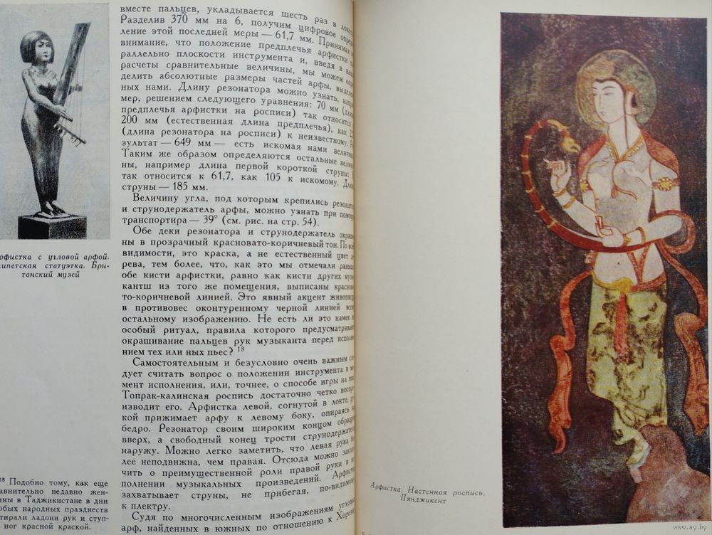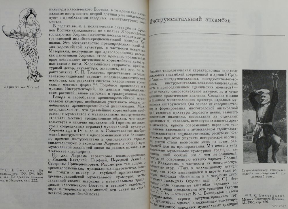 Большой энциклопедический формат. Мелованный альбом. Тираж 1200 экз. 148 стр. Страна с красивой фамилией Хорезм — не далёкий фантастический край. Хорезм рядом, он в Средней Азии, в низовьях бурной и многоводной Аму-Дарьи. История Хорезма сложна и противоречива. С Хорезмом связаны имена ахеменидского царя Дария Гистаспа и Александра Македонского, арабского полководца Кутейбы ибн-Муслима, грозного Чингисхана и Тимура. По сей день поднимаются над зелёными полями развалины древних крепостей с тёмными щелевидными зрачками бойниц. Эти крепости — молчаливые свидетели былых битв. Внутри развалин тихо и покойно: бесшумно проносятся ласточки, пахнет водой и горячим камнем... А когда наступает вечер, в развалинах слышится тихая музыка. Никого там нет, и никто не играет, но старинные мелодии льются, шелестят и звенят, и непонятно — откуда они: то ли шепчутся чёрные тени, струится лунный свет или поют древние звёзды. Народное поверье говорит, что это — музыка, летящая к нам из пучины времени. Что древняя земля Хорезма так богата и полна мелодиями, что даже небольшая горсть этой земли поёт и играет. И как день зарождается ночью, так новая музыка нового Хорезма началась во тьме прошедших веков. Эта книга — об археологии и древней музыке. Точнее, о музыкальной археологии, ещё точнее — о музыкальной археологии Хорезма. А если попытаться выразить всё это одним словом, то эта книга — о поиске, научном поиске. Мало кто знает, что история музыкальных инструментов не менее, а порой более интересна и загадочна, чем история знаменитых бриллиантов или картин. Достаточно, например, вспомнить таинственное воздействие на слушателей стеклянной гармоники или трагическую судьбу ирландских арфистов, некогда объявленных вне закона. Древнейшие музыкальные инструменты, обнаруженные археологическими раскопками, чрезвычайно любопытны как фактам своего существования, так и историей их открытия, обычно неожиданного. Огромная радость охватывает археолога-музыковеда, когда он находит подлинный инструмент. Здесь место для научного поиска поистине безгранично. Но и всякий другой источник, например, изображение древнего музыканта с музыкальным инструментом, тоже несёт в себе огромный заряд творческой энергии, поскольку «материализация» инструмента и увлекательна, и сложна. История Хорезма погребена в песках среднеазиатских пустынь. Три с лишним десятилетия коллектив археологов, руководимый членом-корреспондентом АН СССР С. П. Толстовым, ведёт раскопки на землях древнего орошения в низовьях Аму-Дарьи. Результаты работы учёных превзошли все ожидания. Заговорили развалины покинутых городов, зазвучала древнехорезмийская речь, ожила многокрасочная живопись. Некоторые археологические находки — настенные росписи, монументальная скульптура, глиняные фигурки людей, серебряные изделия — позволили приоткрыть завесу над одной из самых туманных и трудно доступных областей духовной культуры древних хорезмийцев — музыкой. Как известно, в глубокой древности музыку не записывали, её передавали на слух от поколения к поколению. Поэтому в распоряжении исследователя имеется немногое: редкие древние мелодии, до сих пор блуждающие в океане народной музыки, письменные свидетельства древних авторов, а также найденные в археологических раскопках музыкальные инструменты 