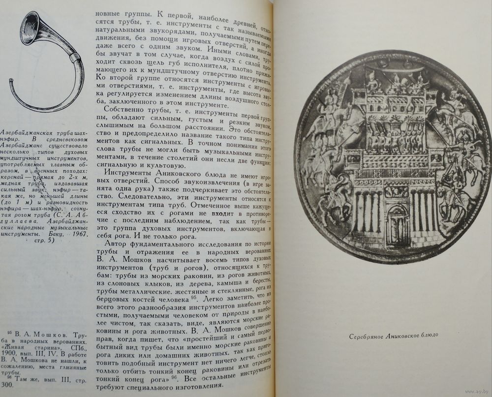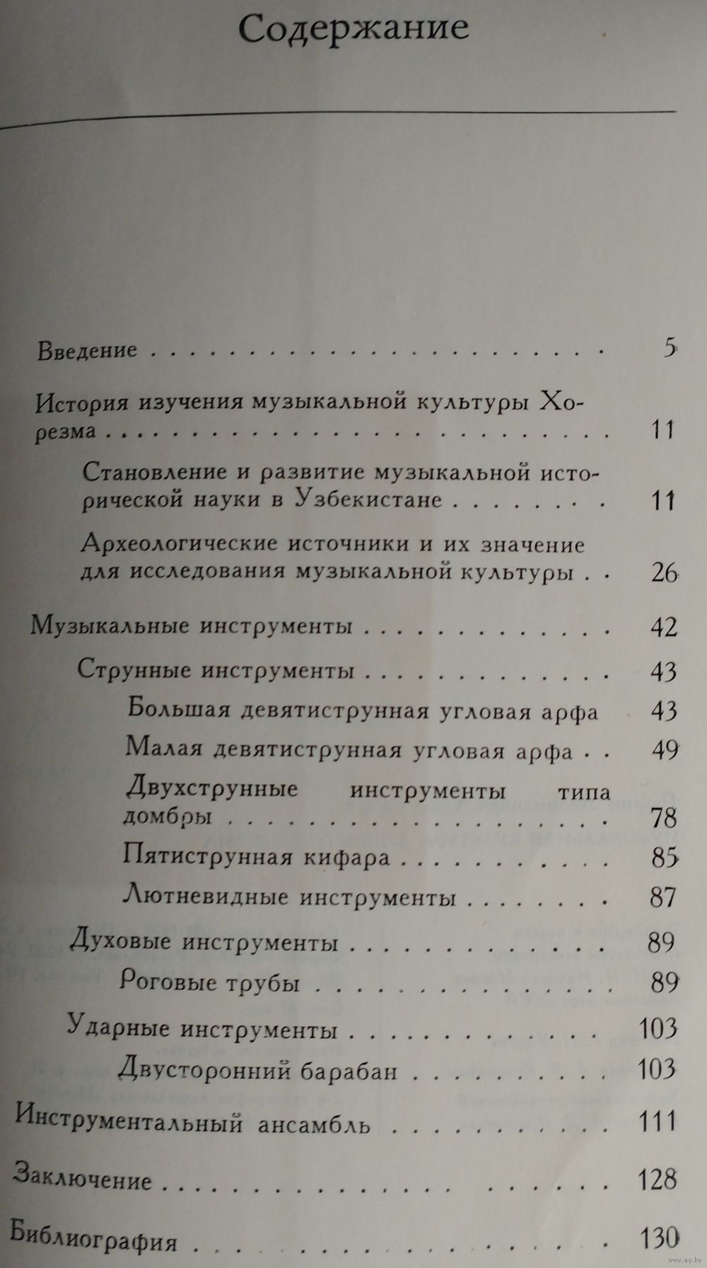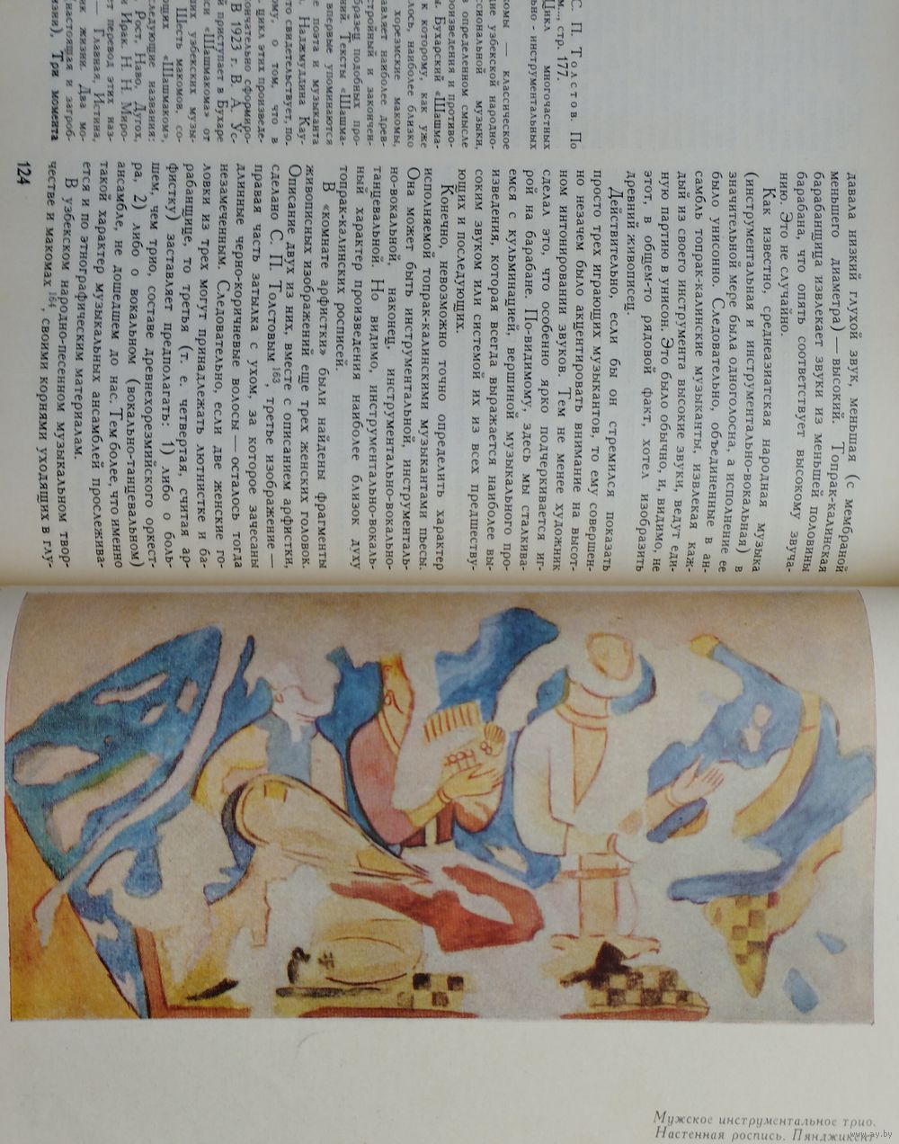 Большой энциклопедический формат. Мелованный альбом. Тираж 1200 экз. 148 стр. Страна с красивой фамилией Хорезм — не далёкий фантастический край. Хорезм рядом, он в Средней Азии, в низовьях бурной и многоводной Аму-Дарьи. История Хорезма сложна и противоречива. С Хорезмом связаны имена ахеменидского царя Дария Гистаспа и Александра Македонского, арабского полководца Кутейбы ибн-Муслима, грозного Чингисхана и Тимура. По сей день поднимаются над зелёными полями развалины древних крепостей с тёмными щелевидными зрачками бойниц. Эти крепости — молчаливые свидетели былых битв. Внутри развалин тихо и покойно: бесшумно проносятся ласточки, пахнет водой и горячим камнем... А когда наступает вечер, в развалинах слышится тихая музыка. Никого там нет, и никто не играет, но старинные мелодии льются, шелестят и звенят, и непонятно — откуда они: то ли шепчутся чёрные тени, струится лунный свет или поют древние звёзды. Народное поверье говорит, что это — музыка, летящая к нам из пучины времени. Что древняя земля Хорезма так богата и полна мелодиями, что даже небольшая горсть этой земли поёт и играет. И как день зарождается ночью, так новая музыка нового Хорезма началась во тьме прошедших веков. Эта книга — об археологии и древней музыке. Точнее, о музыкальной археологии, ещё точнее — о музыкальной археологии Хорезма. А если попытаться выразить всё это одним словом, то эта книга — о поиске, научном поиске. Мало кто знает, что история музыкальных инструментов не менее, а порой более интересна и загадочна, чем история знаменитых бриллиантов или картин. Достаточно, например, вспомнить таинственное воздействие на слушателей стеклянной гармоники или трагическую судьбу ирландских арфистов, некогда объявленных вне закона. Древнейшие музыкальные инструменты, обнаруженные археологическими раскопками, чрезвычайно любопытны как фактам своего существования, так и историей их открытия, обычно неожиданного. Огромная радость охватывает археолога-музыковеда, когда он находит подлинный инструмент. Здесь место для научного поиска поистине безгранично. Но и всякий другой источник, например, изображение древнего музыканта с музыкальным инструментом, тоже несёт в себе огромный заряд творческой энергии, поскольку «материализация» инструмента и увлекательна, и сложна. История Хорезма погребена в песках среднеазиатских пустынь. Три с лишним десятилетия коллектив археологов, руководимый членом-корреспондентом АН СССР С. П. Толстовым, ведёт раскопки на землях древнего орошения в низовьях Аму-Дарьи. Результаты работы учёных превзошли все ожидания. Заговорили развалины покинутых городов, зазвучала древнехорезмийская речь, ожила многокрасочная живопись. Некоторые археологические находки — настенные росписи, монументальная скульптура, глиняные фигурки людей, серебряные изделия — позволили приоткрыть завесу над одной из самых туманных и трудно доступных областей духовной культуры древних хорезмийцев — музыкой. Как известно, в глубокой древности музыку не записывали, её передавали на слух от поколения к поколению. Поэтому в распоряжении исследователя имеется немногое: редкие древние мелодии, до сих пор блуждающие в океане народной музыки, письменные свидетельства древних авторов, а также найденные в археологических раскопках музыкальные инструменты 