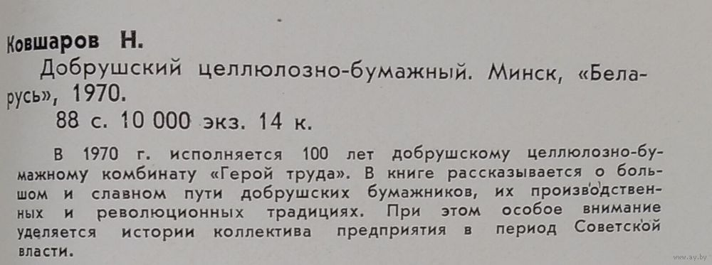 Н. Ковшаров. Добрушский целлюлозно-бумажный. Серия: История фабрик и заводов. Минск : Беларусь, 1970 г. 85 с. Мягкая обложка. Уменш. формат.