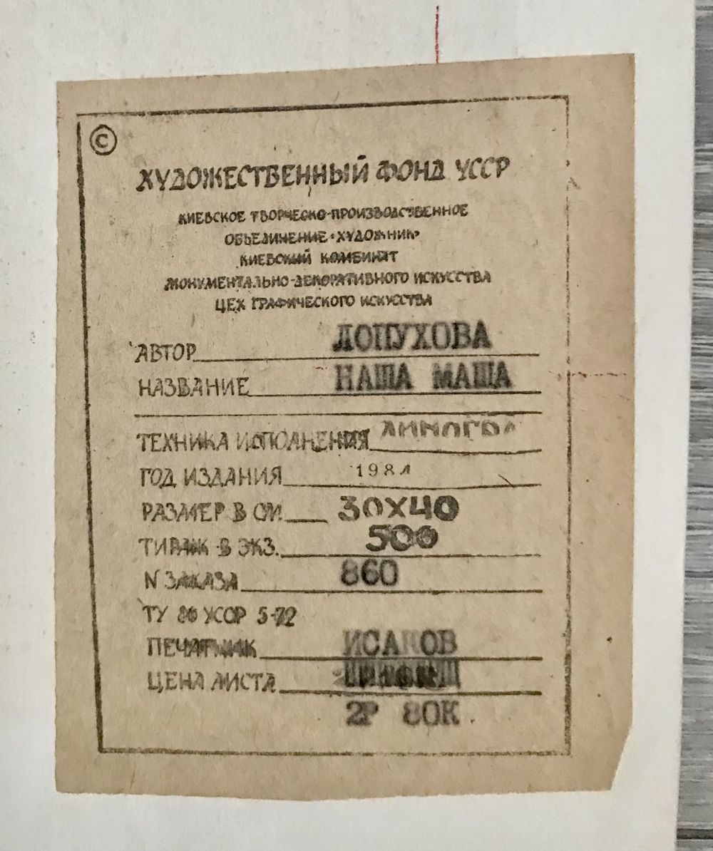 Линогравюра «Наша Маша» автор Н.И.Лопухова, украинский график, народный художник Украины. Размер листа 30х40см., 1984г. Состояние хорошее.