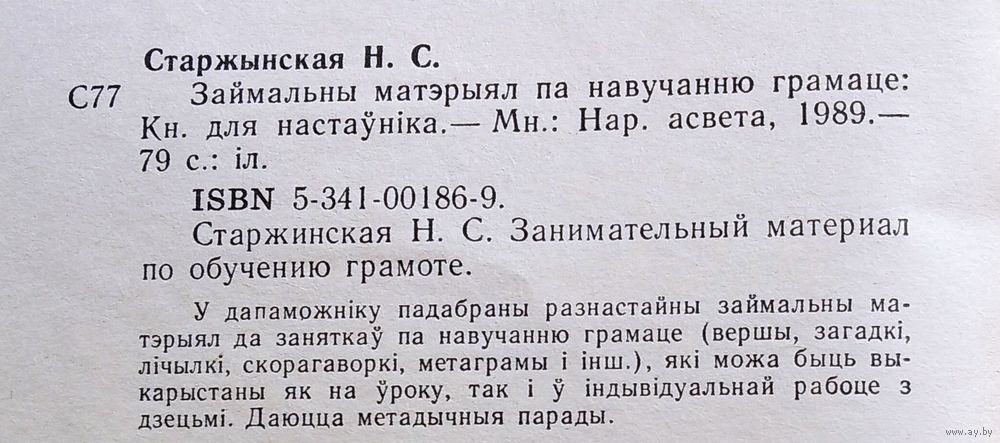 Н. С. Старжынская. Займальны матэрыял па навучанню грамаце: кніга для настаўніка. Мінск : Народная асвета, 1989 г. 77 с. Мяккая вокладка.