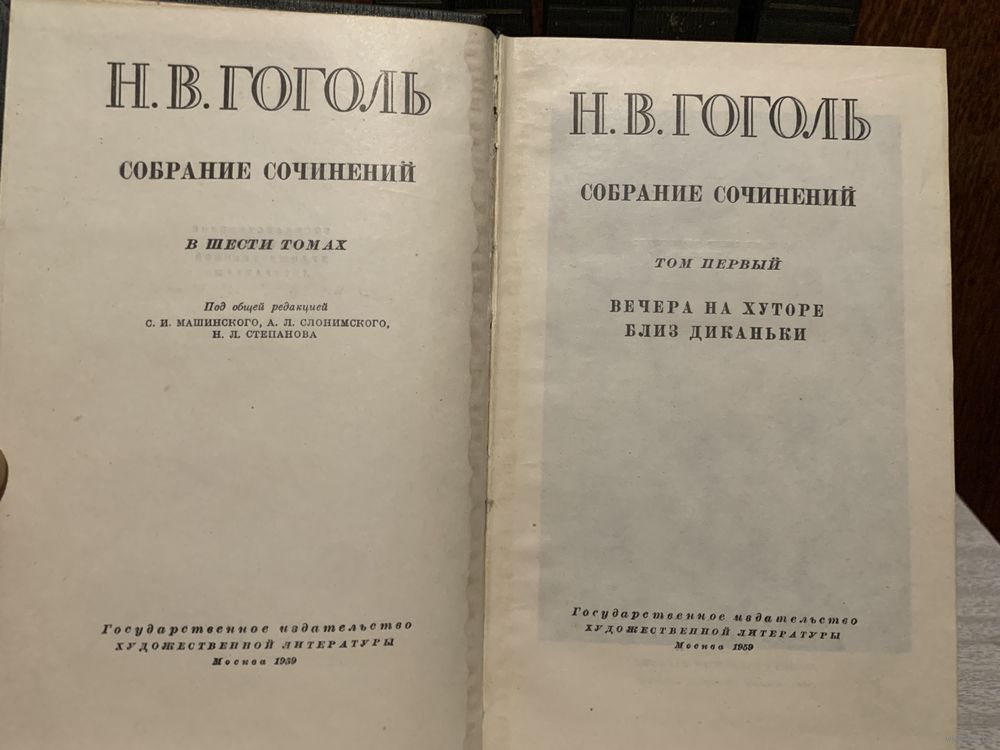Собрание сочинений Н.В.Гоголя в 6-ти томах, имеются все, состояние приемлемое.