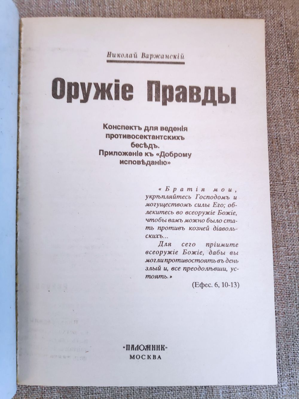 аржанский Н. Оружие правды. Конспект для ведения противосектантских бесед. Приложение к Доброму исповеданию. Репринтное издание. М.: Паломник. 1991г.- 140 с. Мягкий переплет, стандартный формат.