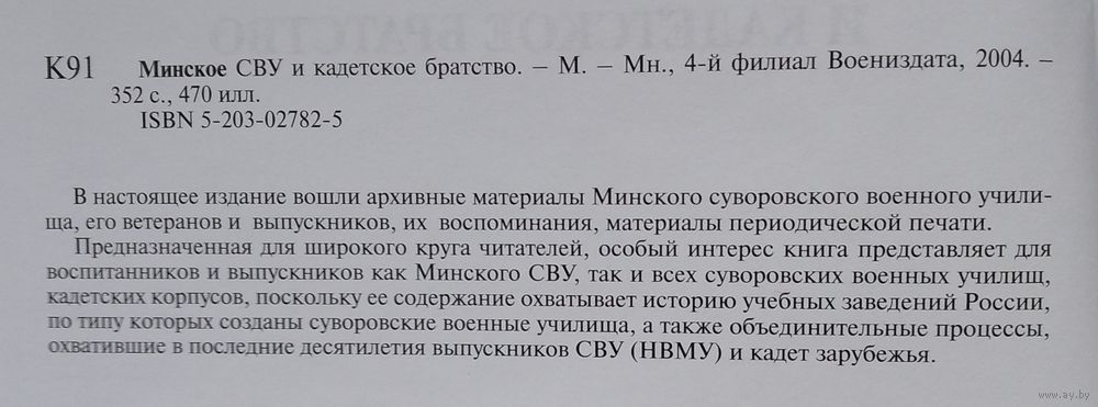 Н. З. Кунц, Н. И. Смирнов при участии В. И. Белозерова. Минское СВУ и кадетское братство. Москва : Минск : 4-й филиал Воениздата, 2004 г. 351 с. Твердый переплет. Энциклопедический формат.