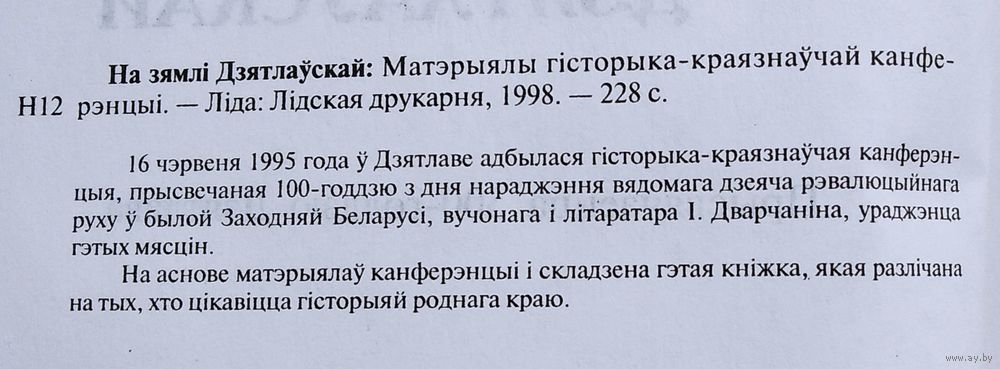 На зямлі Дзятлаўскай: матэрыялы гісторыка-краязнаўчай канферэнцыі, прысвечанай 100-годдзю з дня нараджэння І. С. Дварчаніна і 500-годдзю Дзятлава, 16 чэрвеня 1995 г., Дзятлава.рэдкалегія: А. У. Богуш (навуковы рэдактар) і інш. - Гродна : [б. в.], 1998 г. 227 с. Мяккая вокладка.