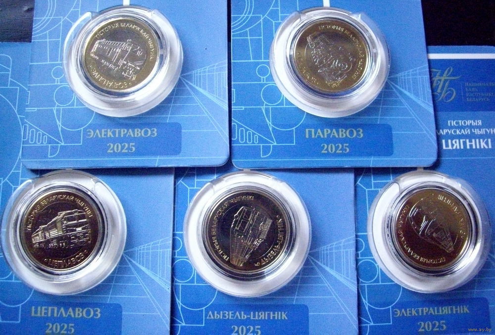 Набор 2 рубля 2025 Железная дорога. 5 монет в блистерах: Паровоз, Тепловоз, Электровоз, Дизель-поезд, Электропоезд. Распродажа коллекции!