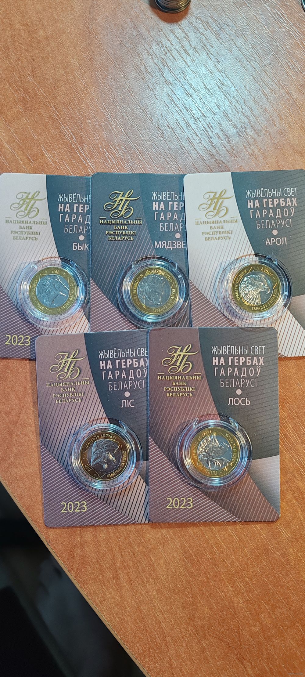 Набор 5*2 рубля. В блистерах. Орел. Медведь. Бык. Лис. Лось. Серии "животный мир на гербах городов Беларуси", "Жывёльны свет на гербах гарадоў Беларусі". 2023год