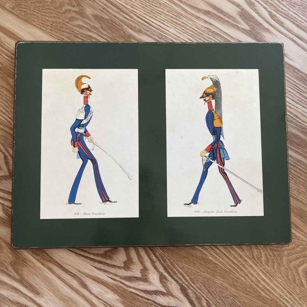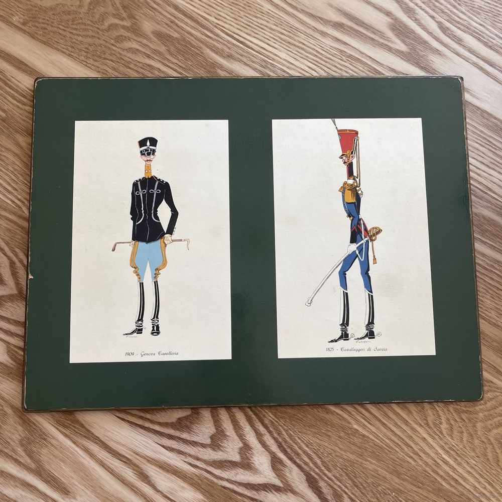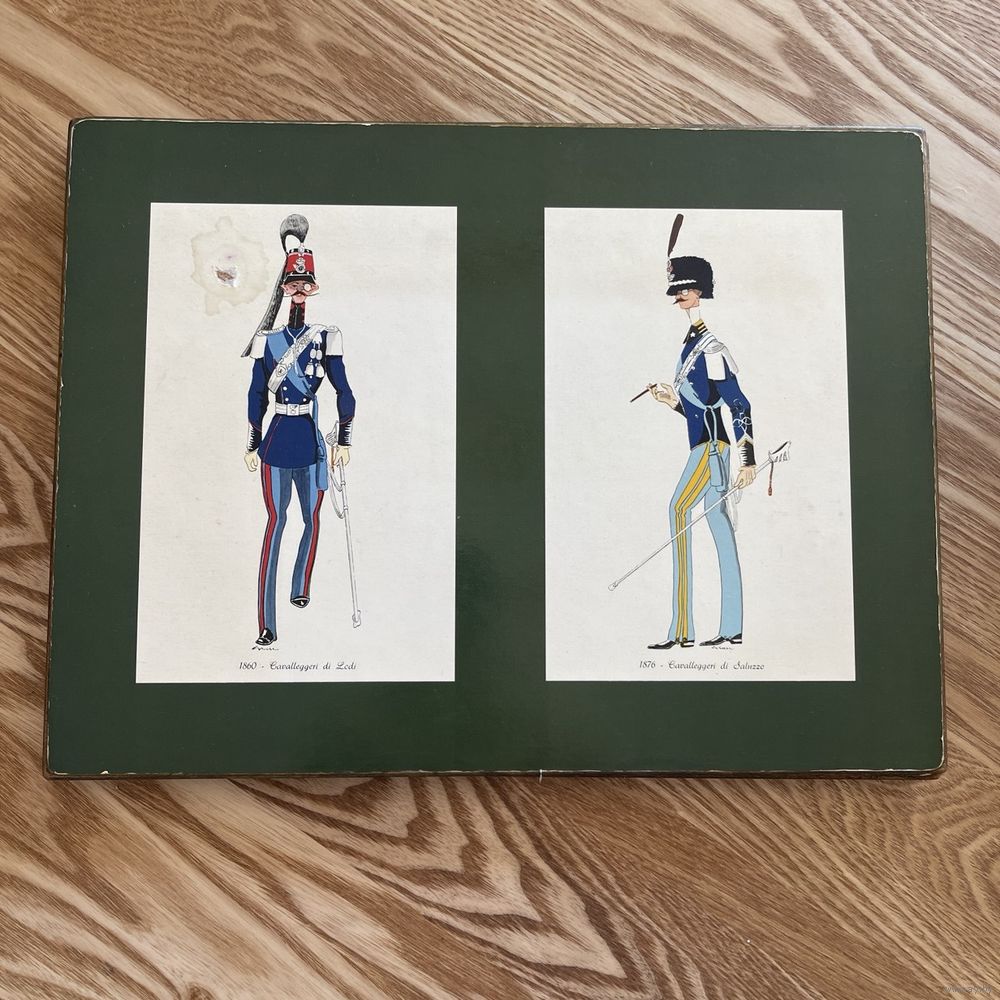 Набор антикварных сервировочных подставок под тарелки и горячие блюда с изображением офицеров в форме итальянских кавалерийских полков разных периодов. В наборе 6 шт. Италия. 1950-е г.г. Акриловое покрытие на бархатной подложке. На каждой подставке сохранен маркировочный стикер антикварного магазина. Изображения на подставках не повторяются. Со следами времени и бытования, одна подставка с дефектом (см. фото, учтено в цене) . Размер 40 х 30 см.