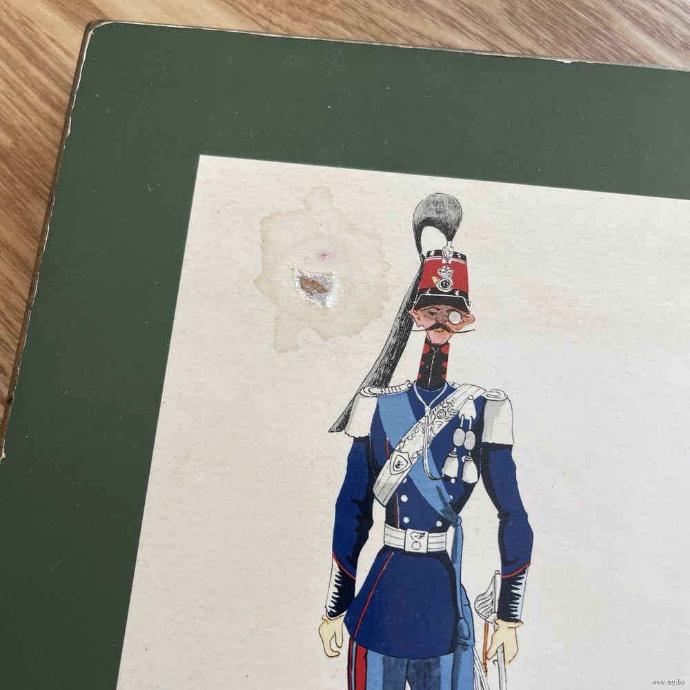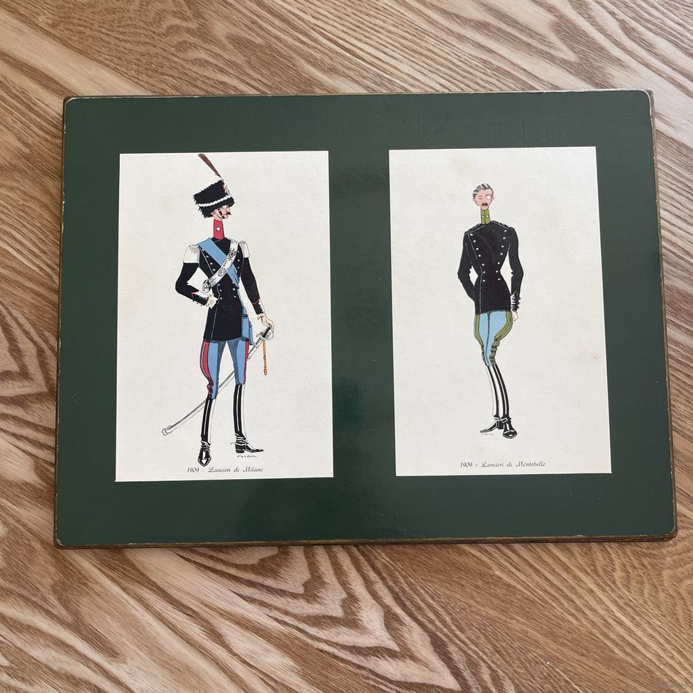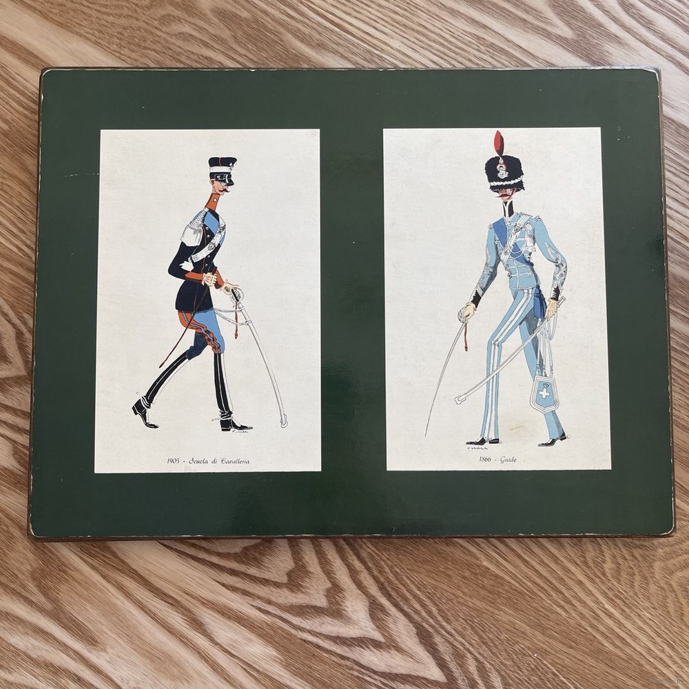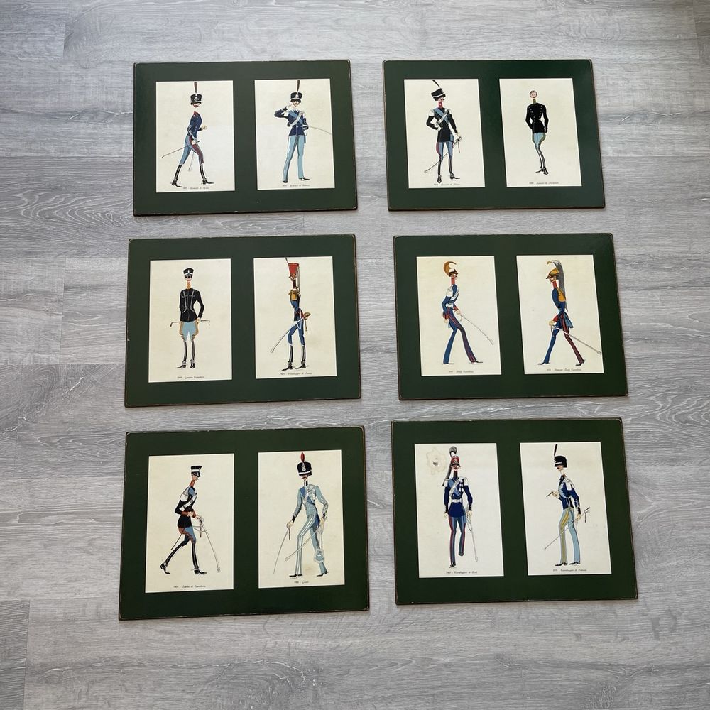 Набор антикварных сервировочных подставок под тарелки и горячие блюда с изображением офицеров в форме итальянских кавалерийских полков разных периодов. В наборе 6 шт. Италия. 1950-е г.г. Акриловое покрытие на бархатной подложке. На каждой подставке сохранен маркировочный стикер антикварного магазина. Изображения на подставках не повторяются. Со следами времени и бытования, одна подставка с дефектом (см. фото, учтено в цене) . Размер 40 х 30 см.