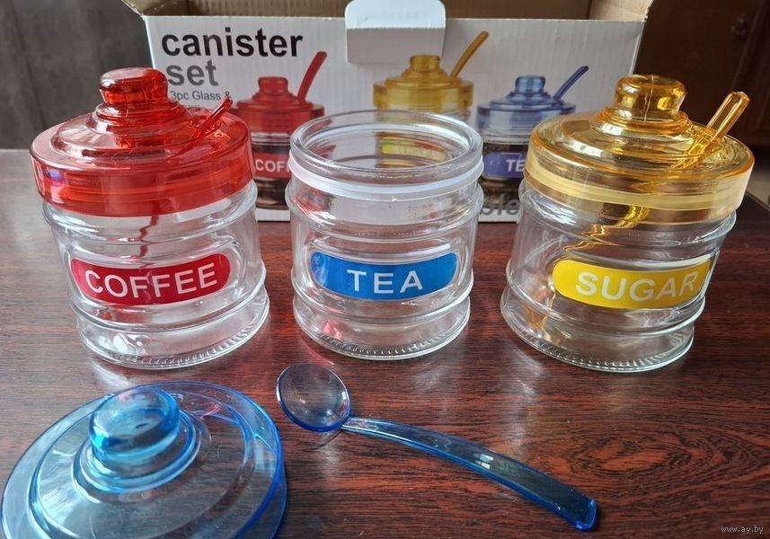 Продается набор баночек для чая, кофе и сахара. Баночки стеклянные, крышечки и ложки - пластик. Новый.