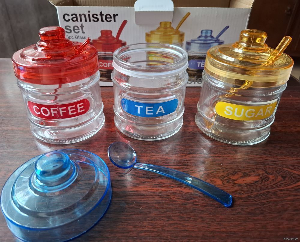 Продается набор баночек для чая, кофе и сахара. Баночки стеклянные, крышечки и ложки - пластик. Новый.Баночки 300 мл