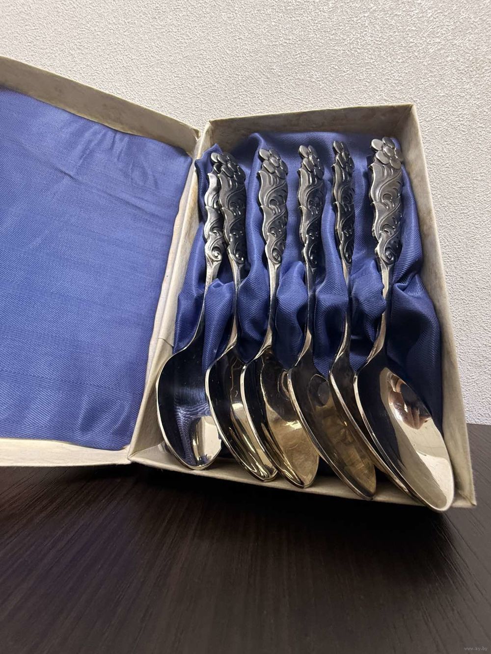 Набор чайных ложек на 6 персон с рельефным декором в виде цветка . Сохранился в хорошем состоянии . Размеры коробки 10.5х17.5х2.7 см . Длинна ложек 16см вес 1 ложки 36 грамм , общий вес ложек 220 грамм , общий вес коробки с набором 331 грамм . В презентабельной подарочной упаковке подойдет в виде хорошего подарка или презента . ВОЗМОЖНЕН ТОРГ .
