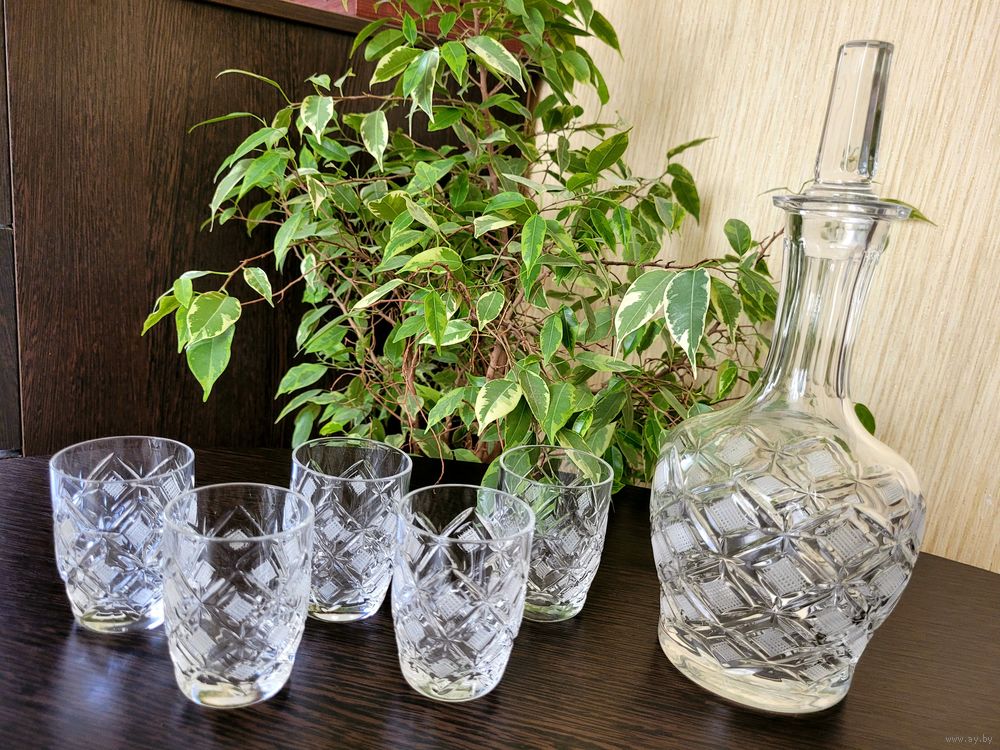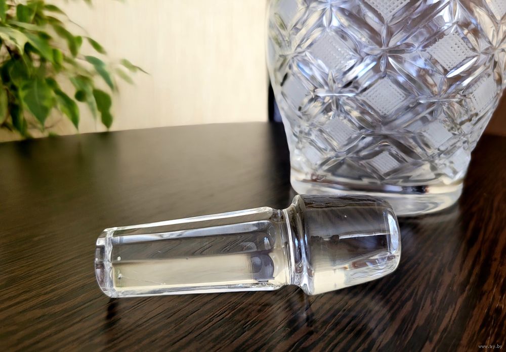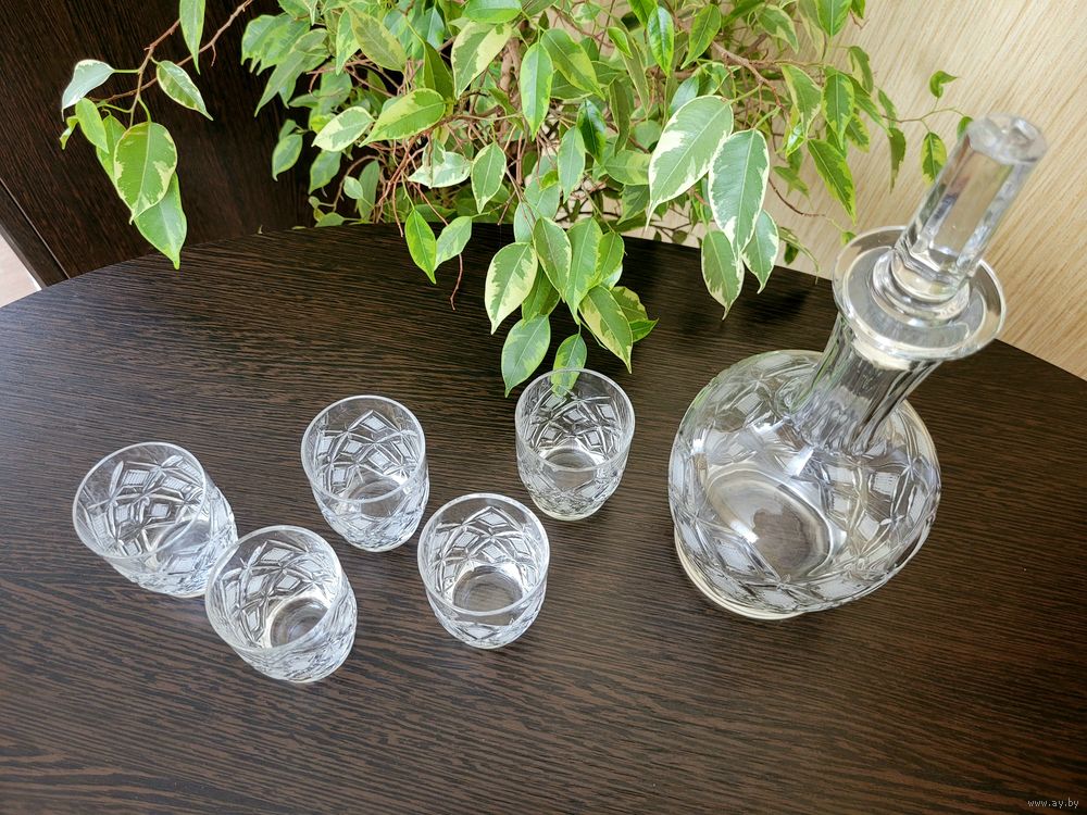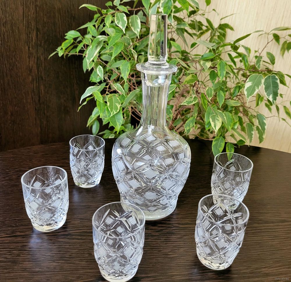 Набор для крепких напитков. Графин, высота 25 см с пробкой, стопки 75 мл, размер 7×5 см, 5 шт. Хрусталь СССР, алмазная грань - ромбы.