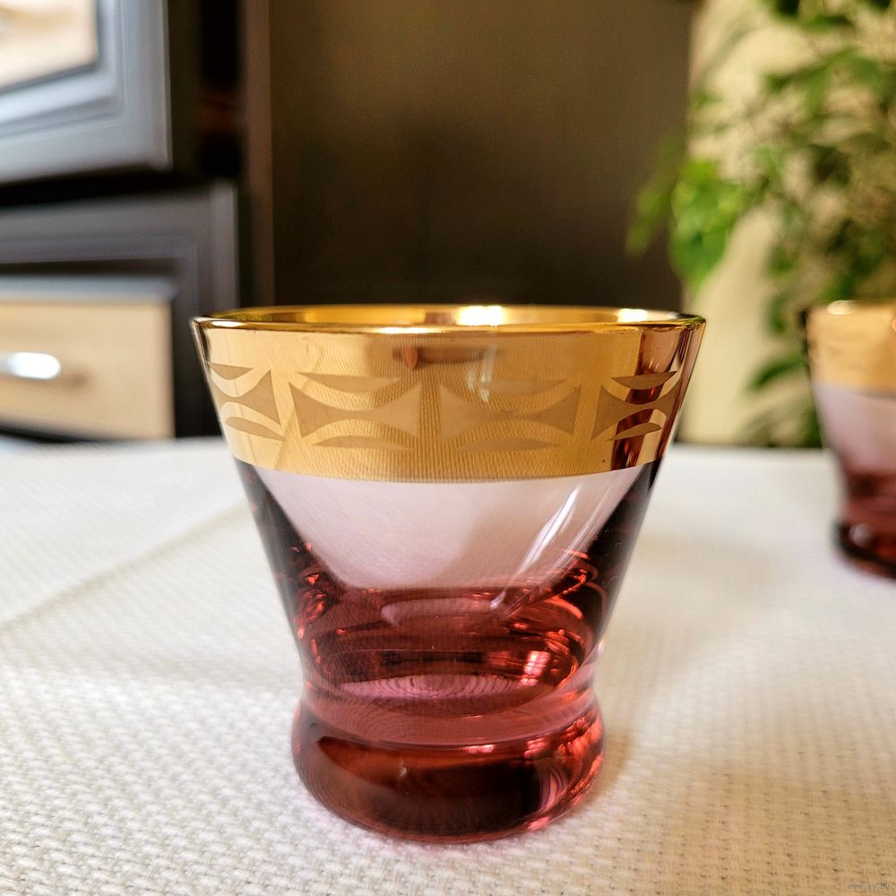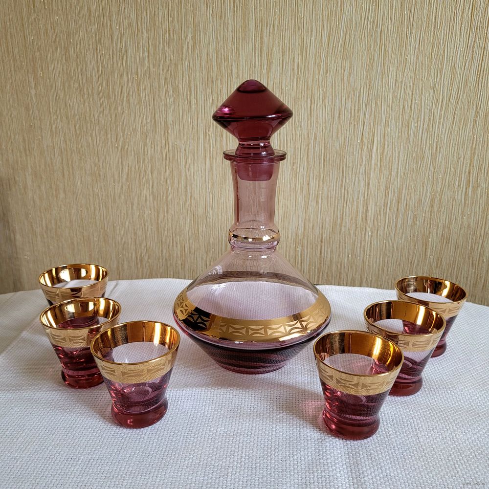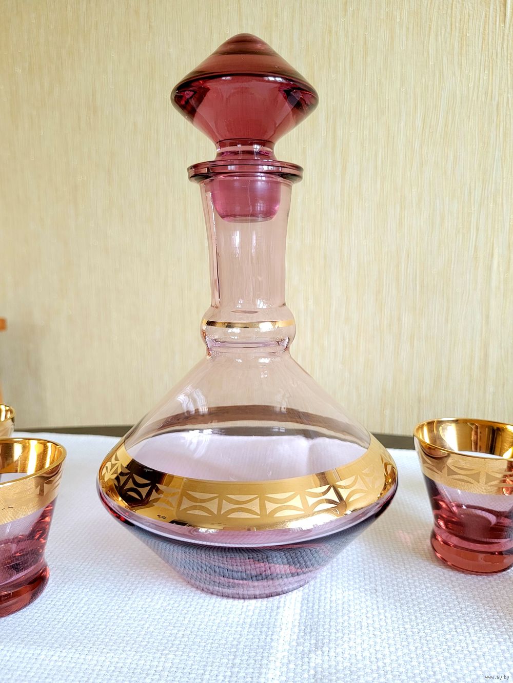 Великолепный набор из марганцевого стекла. Широкая узорчатая золотая лента. Борисовский хрустальный завод им. Дзержинского, набор представлен в каталоге "Бытовая посуда и художественные изделия из стекла" 1979 г. Завод уже прекратил своё существование.