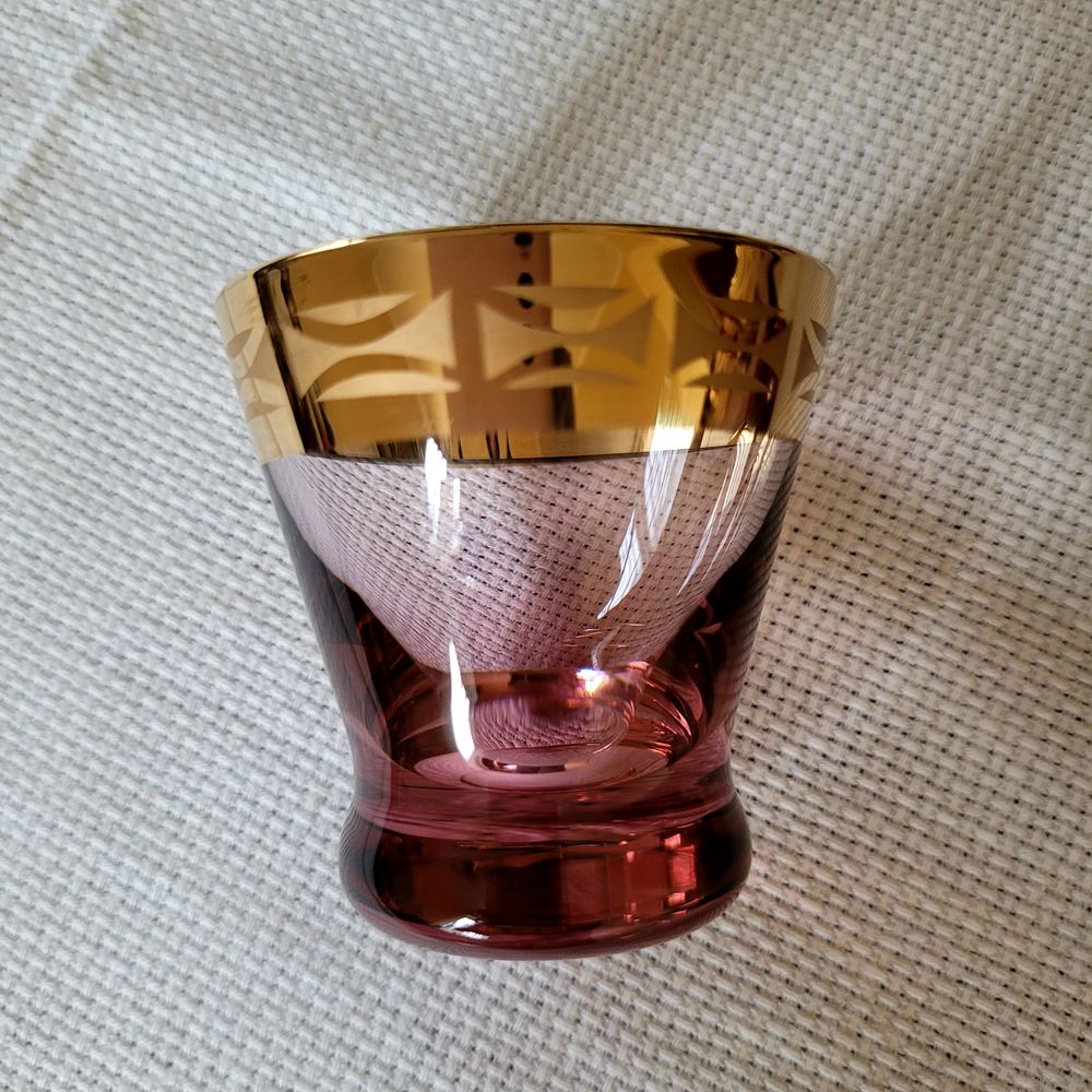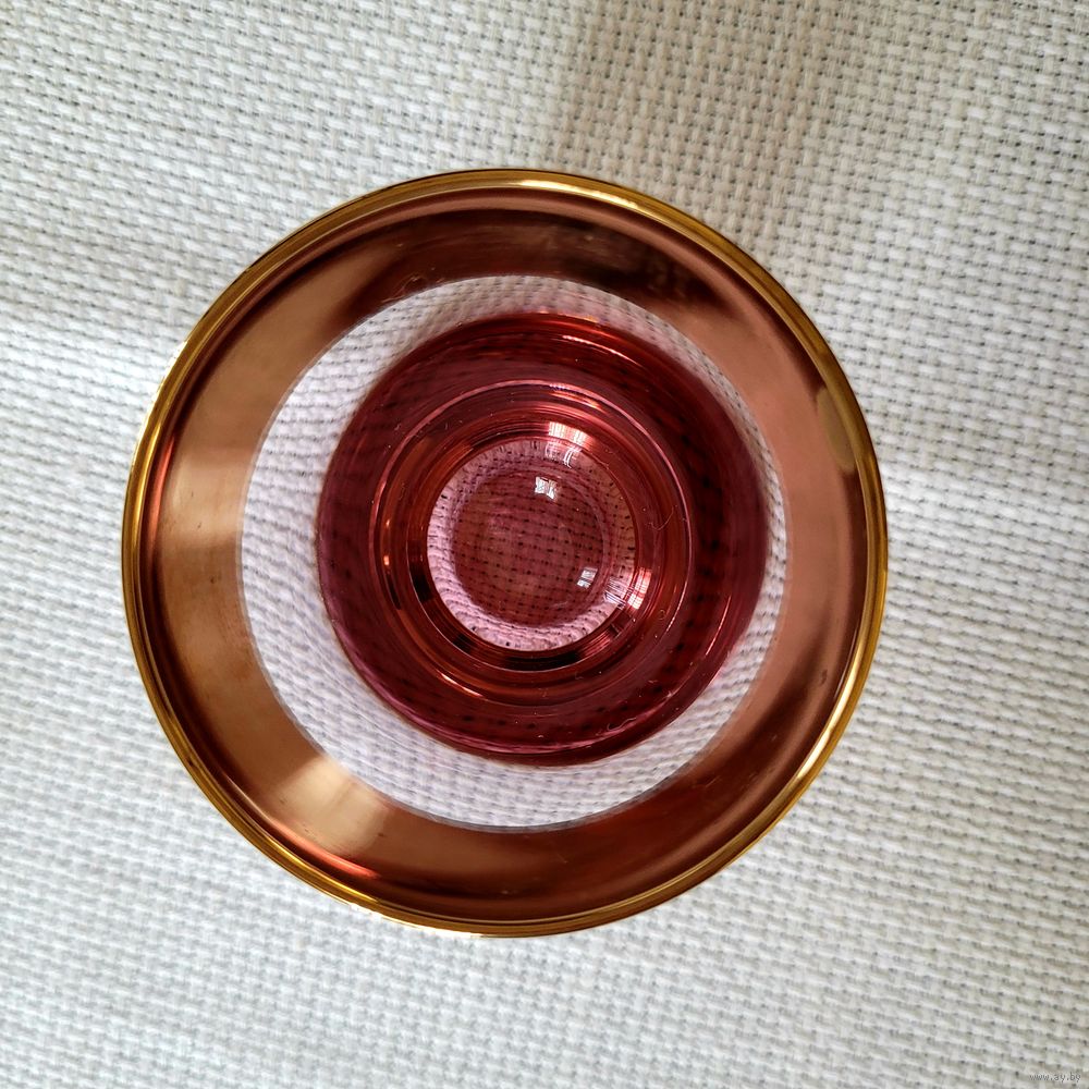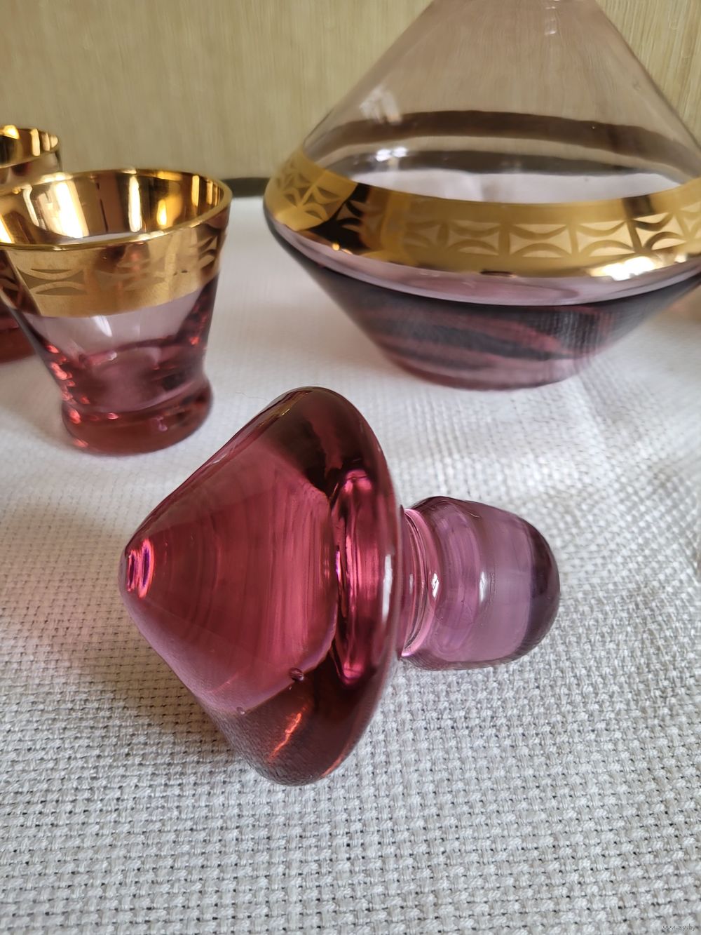 Великолепный набор из марганцевого стекла. Широкая узорчатая золотая лента. Борисовский хрустальный завод им. Дзержинского, набор представлен в каталоге "Бытовая посуда и художественные изделия из стекла" 1979 г. Завод уже прекратил своё существование.