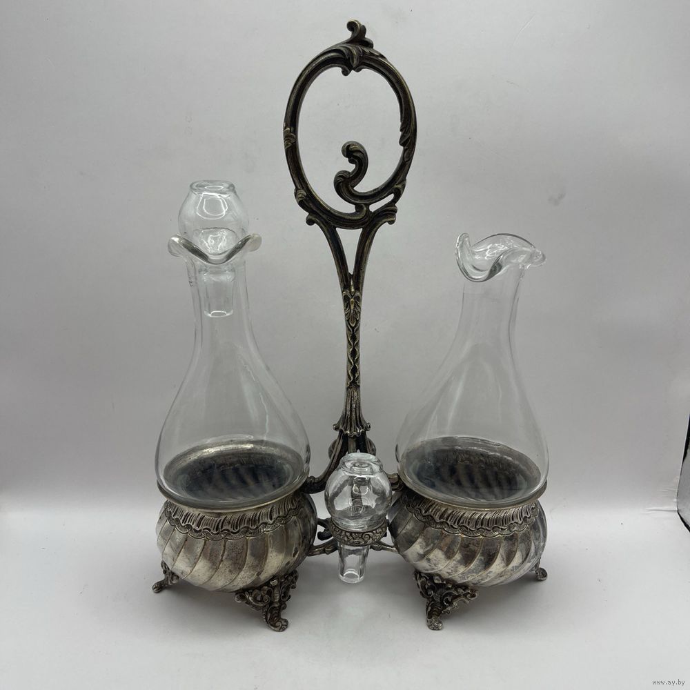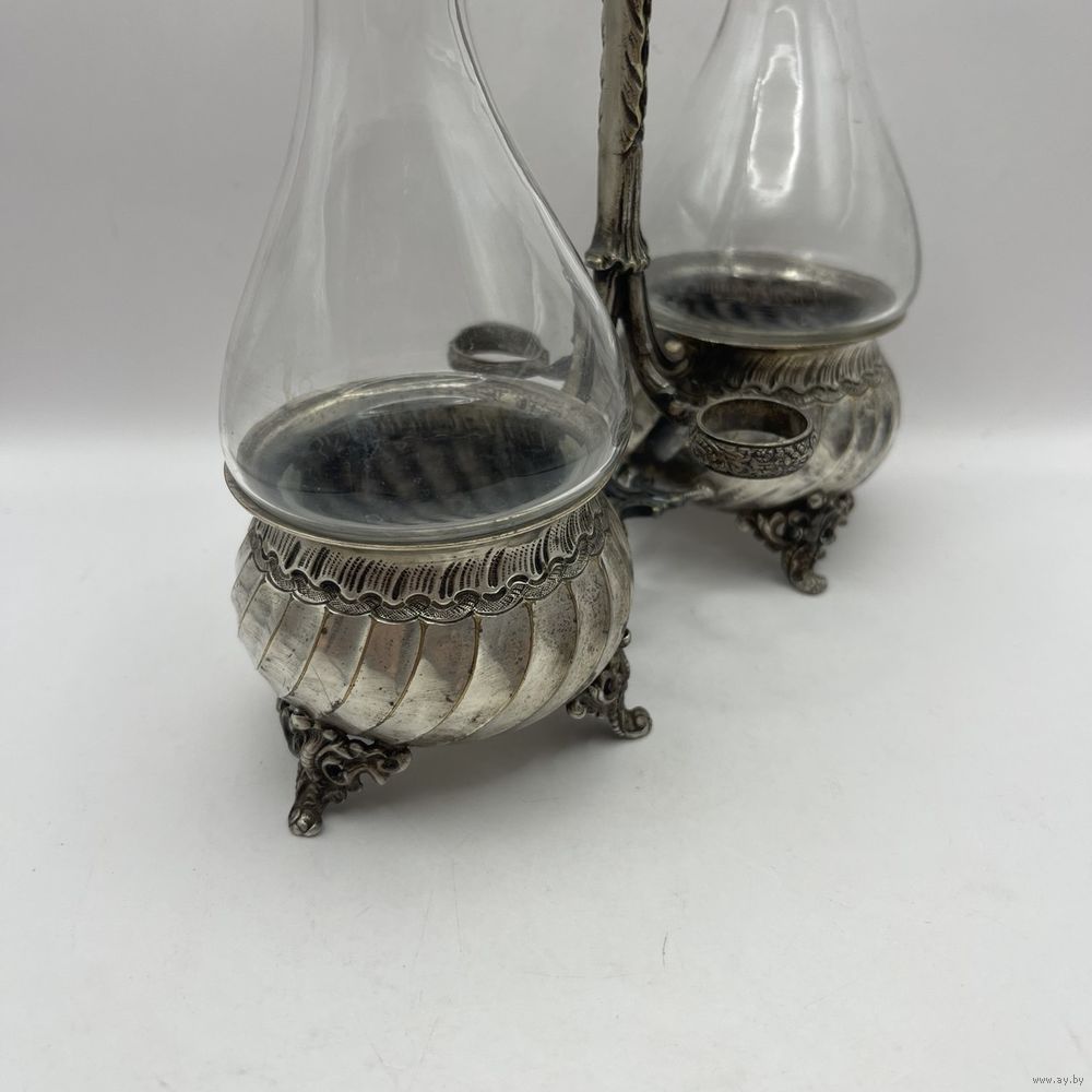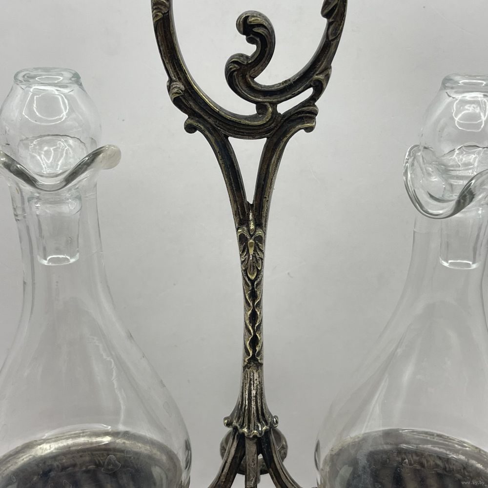 Антикварный набор для сервировки стола в стиле барокко. Два стеклянных кувшинчика для подачи уксуса, масла или других заправок на посеребренной подставке с богатым рельефным декором. С держателями для пробок. Франция. Клейма. 1910-е г.г. Размер 20 х 9 х 26 см. Высота кувшинчика 17 см. Естественная патина.