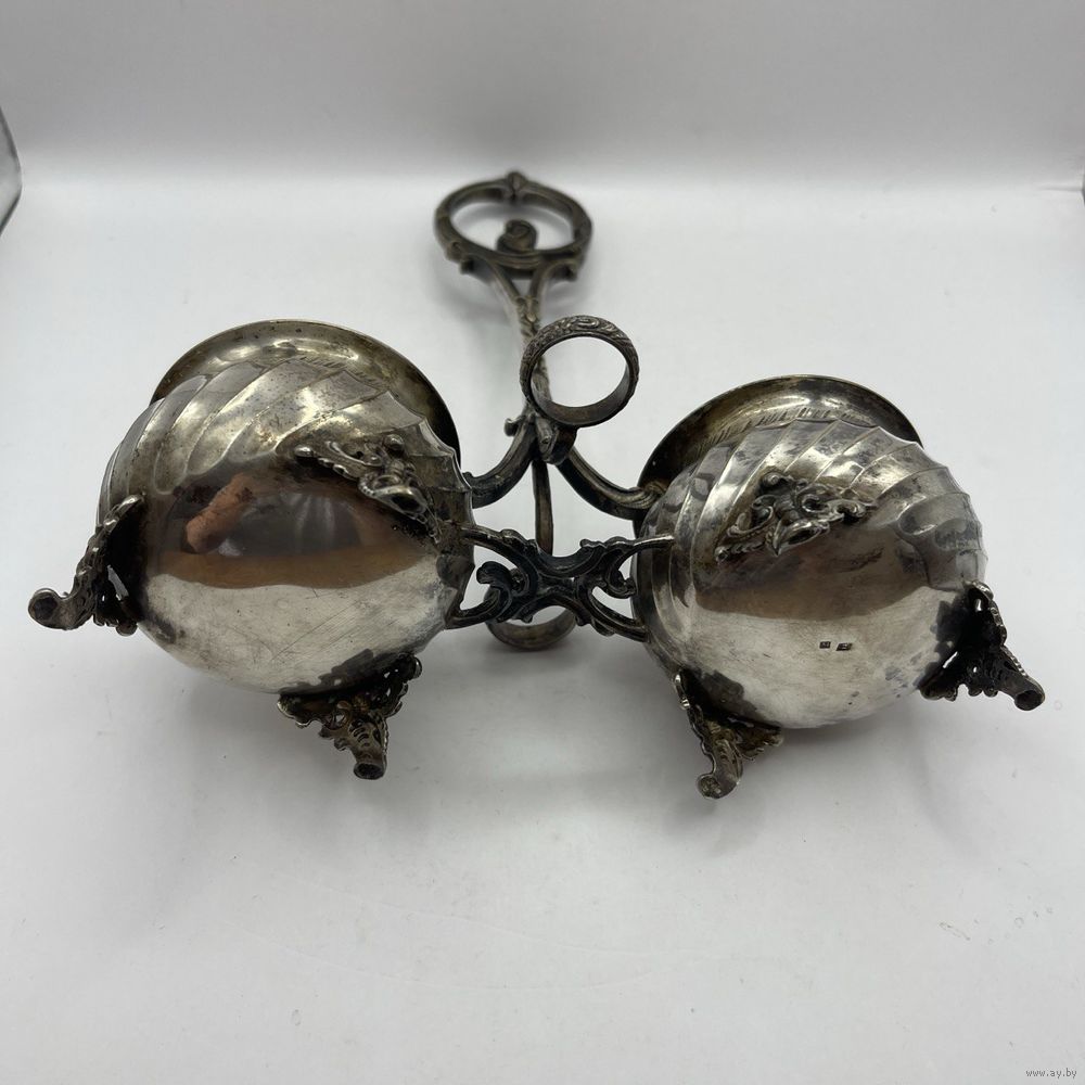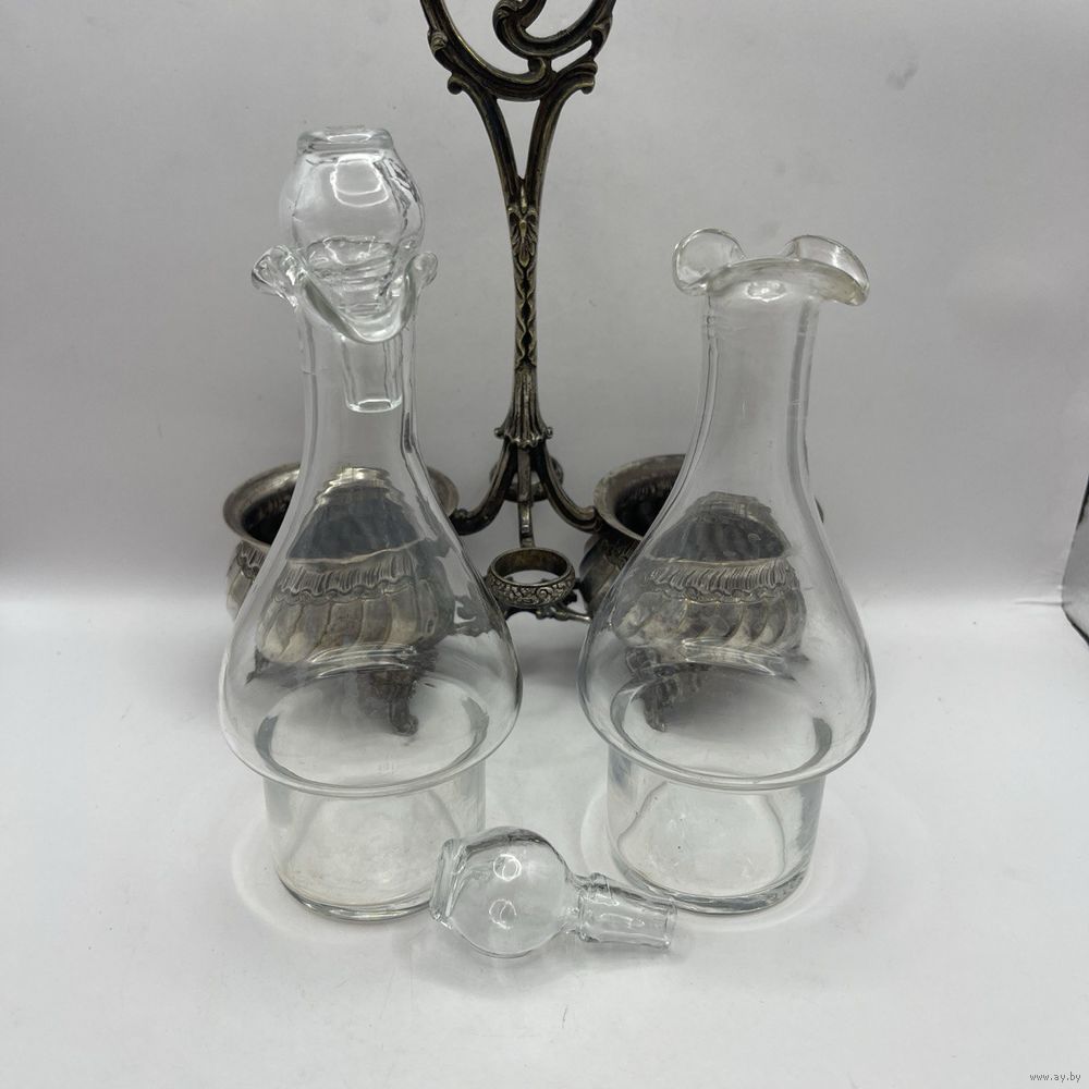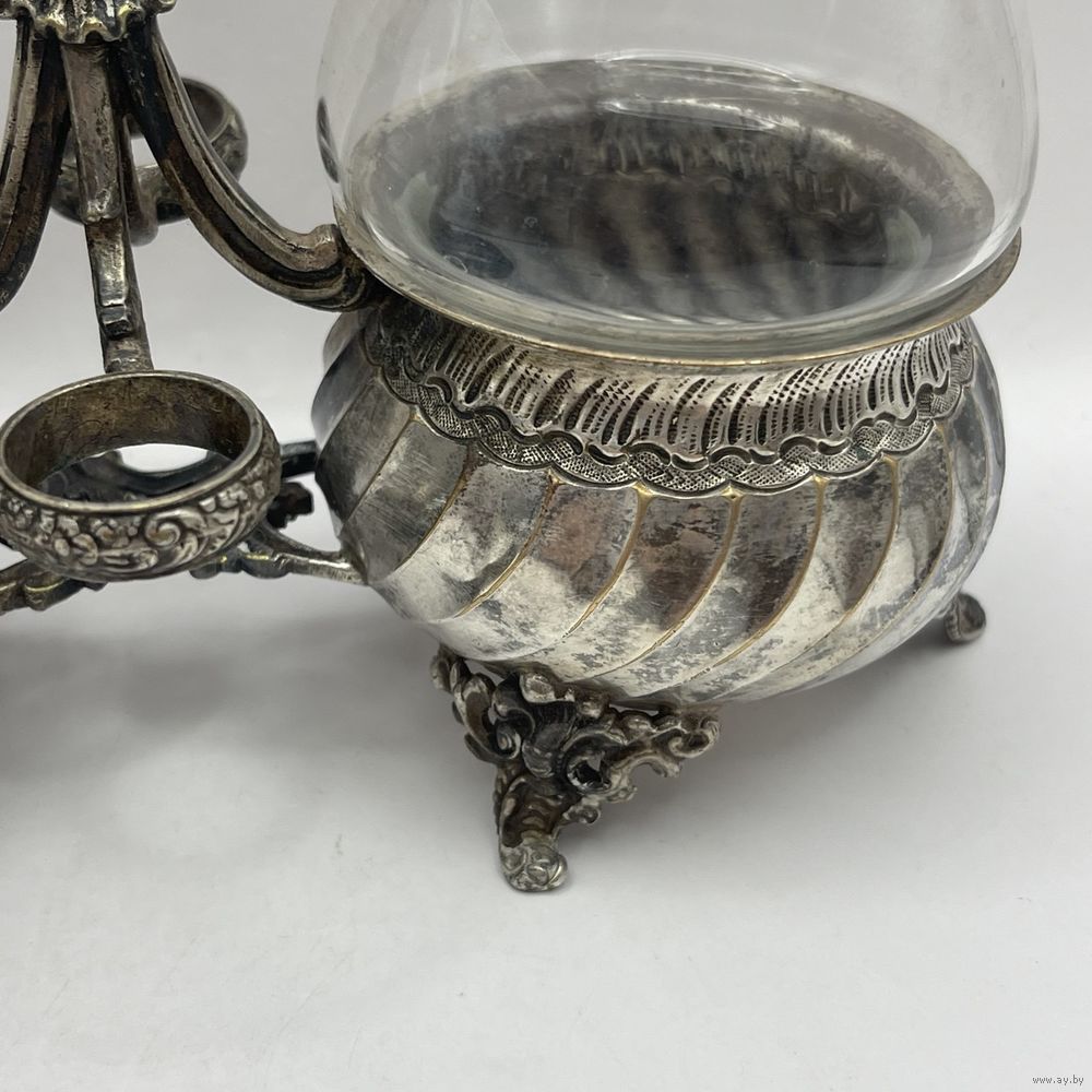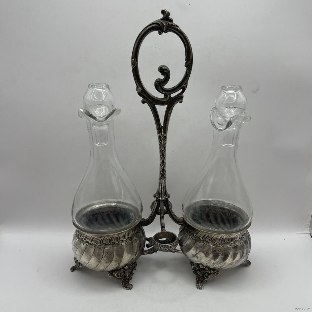 Антикварный набор для сервировки стола в стиле барокко. Два стеклянных кувшинчика для подачи уксуса, масла или других заправок на посеребренной подставке с богатым рельефным декором. С держателями для пробок. Франция. Клейма. 1910-е г.г. Размер 20 х 9 х 26 см. Высота кувшинчика 17 см. Естественная патина.