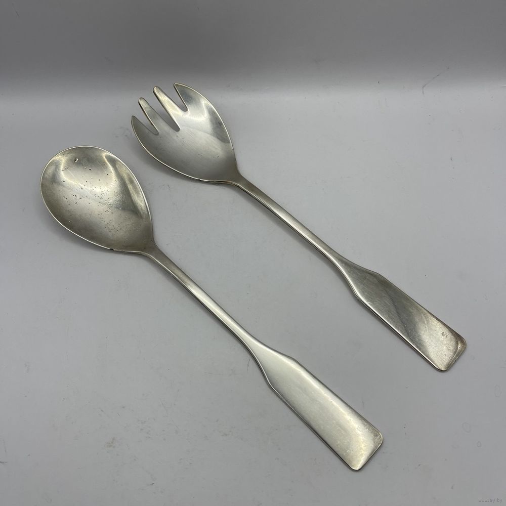 Винтажный набор для перемешивания салата Sheratonn, большие сервировочные ложка и вилка из посеребренного металла. Италия. 1960-е г.г. Клейма. Длина обоих предметов 24 см. Естественная патина, значительные следы бытования.