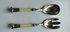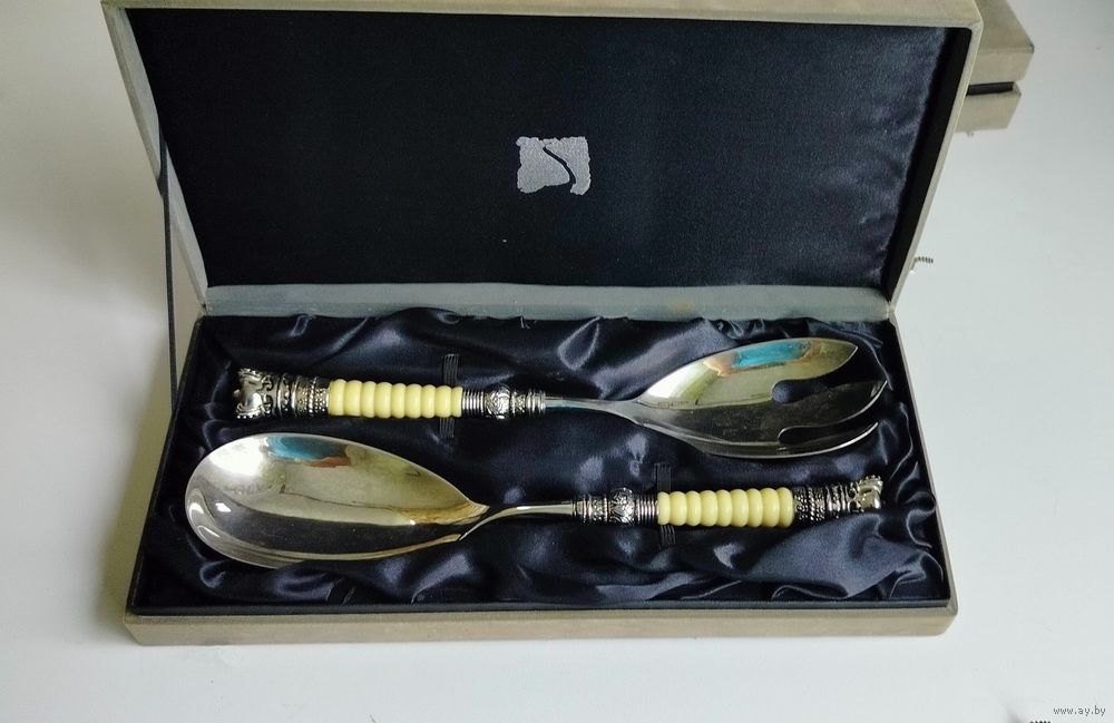Большая пара приборов для подачи салатов. Набор изготовлен из меди и покрыт серебром. Окончание рукояти украшено короной. Длина 29 см.