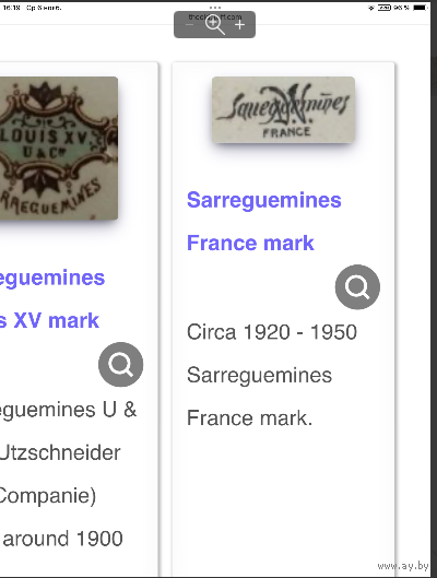 Справочно : Керамическая фабрика SARREGUEMINES FRANCE была основана в 1790 году и просуществовала до 1983 года. Поэтому данный набор можно отнести к разряду коллекционных. Особое развитие фабрика получила благодаря поддержке Наполеона и внедрением технологий Villeroy & Boch