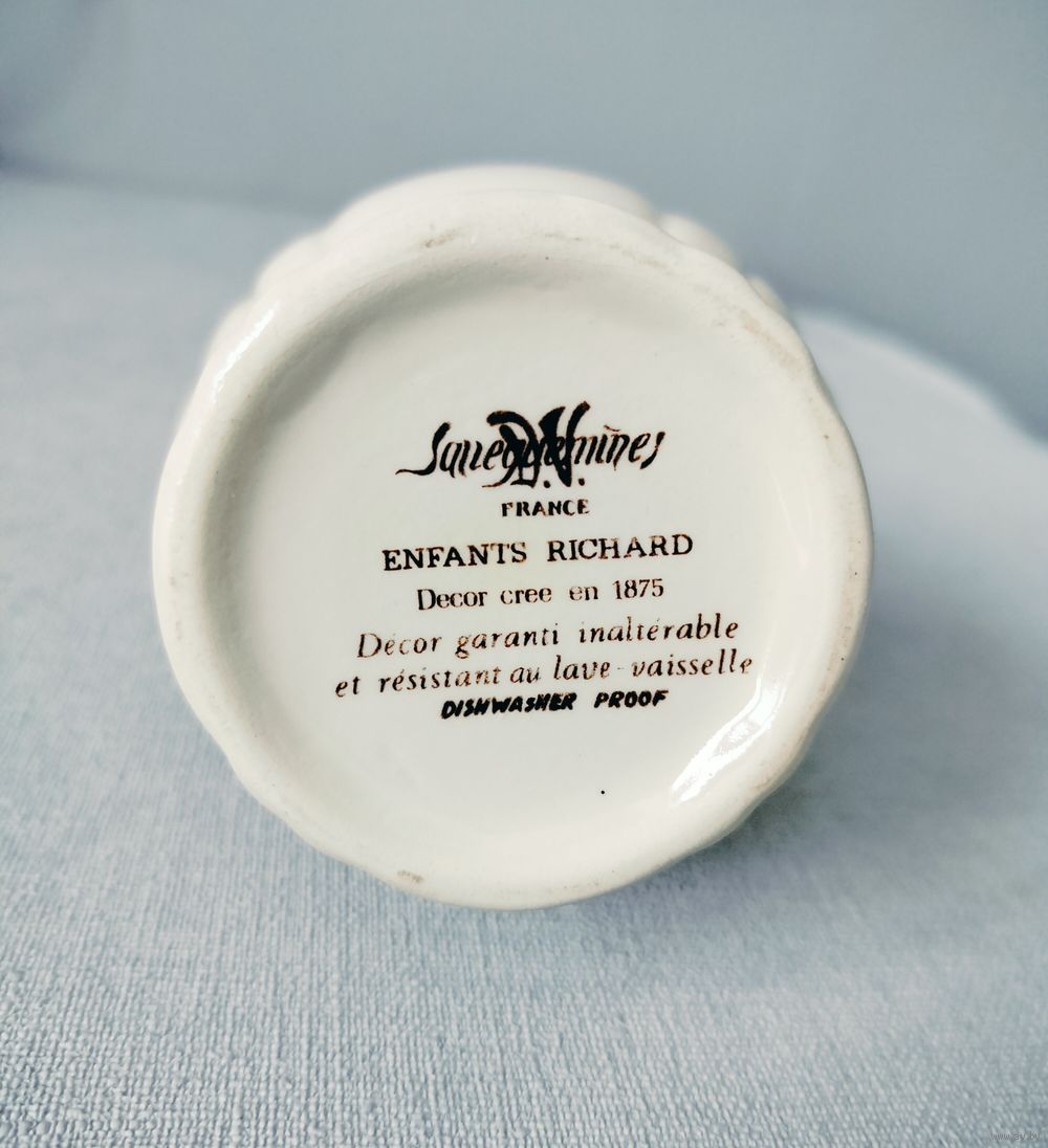Это коллекционный столовый набор французской фаянсовой мануфактуры SARREGUEMINES с декором "Enfants Richard" (дети Ришара), созданным в 1875 году и переиздаваемым в более позднее время как винтажная серия. Период выпуска данной серии 1920-1950 годы. На фото №9 информация из справочника. Без дефектов, но на соуснике был скол и произведена реставрация. Это учтено в цене.