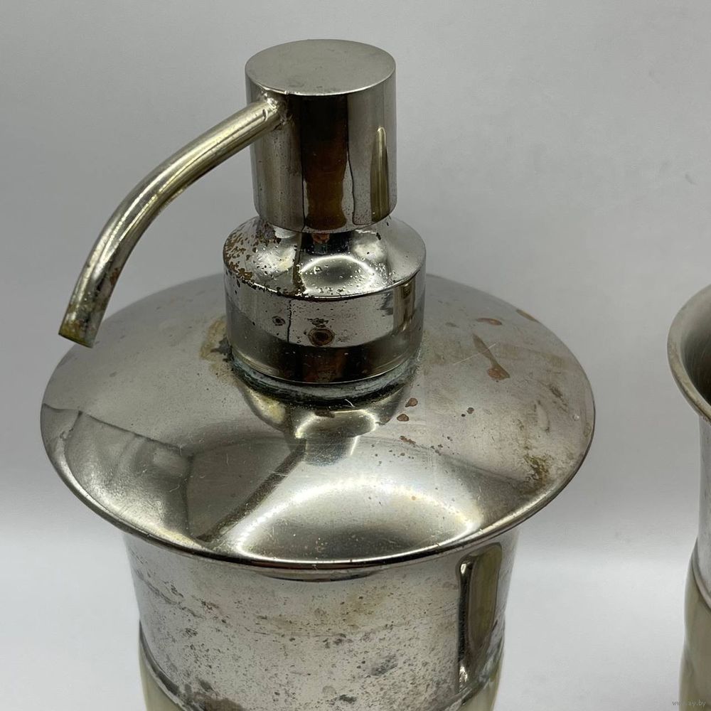 Антикварный набор для ванной комнаты, диспенсер для жидкого мыла и стакан для зубных щеток с ручным декором пластинами натурального перламутра. Франция. 1940-е г.г. Высота стакана 11,5 см, диаметр 8,5 см. Высота диспенсера 18 см, объем 250 мл. Патина и следы времени на металле, следы бытования внутри диспенсера. Дозатор из металла со съемной пластиковой трубкой. Трубочка подлежит замене, т.к. дозатор не срабатывает должным образом.
