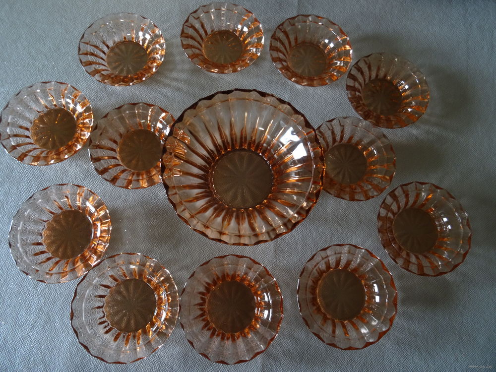 Набор для варенья, карамельное стекло, винтаж СССР, вазочка 1 шт - верх 16 см, донышко 8 см, выс. 5,5 см, розетка - 12 шт -верх 10 см, донышко 6 см, выс 2,5 см