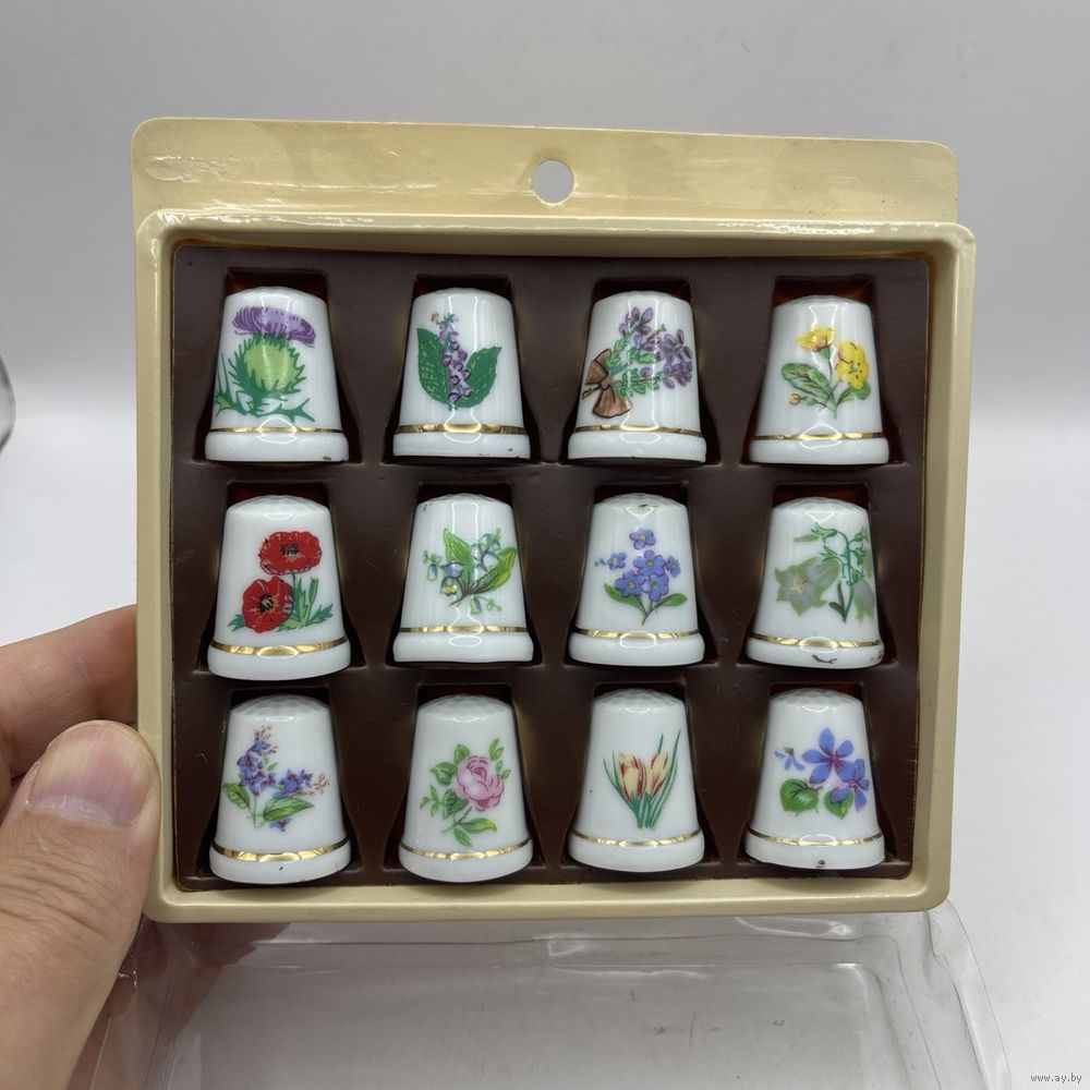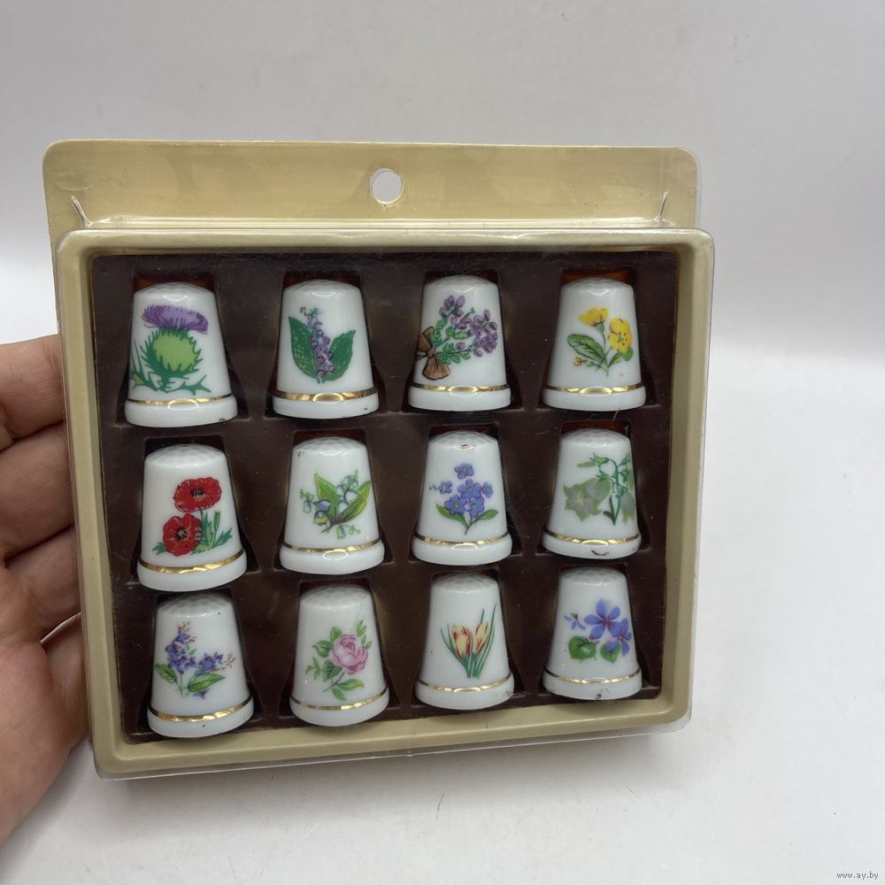 Винтажный набор фарфоровых наперстков с цветочным декором и золотым ободком. В наборе 12 наперстков, декор не повторяется. Германия. 1970-е г.г. Высота наперстка 2,5 см. Оригинальная коробка со следами времени. Размер коробки 14 х 13,5 х 2,5 см.