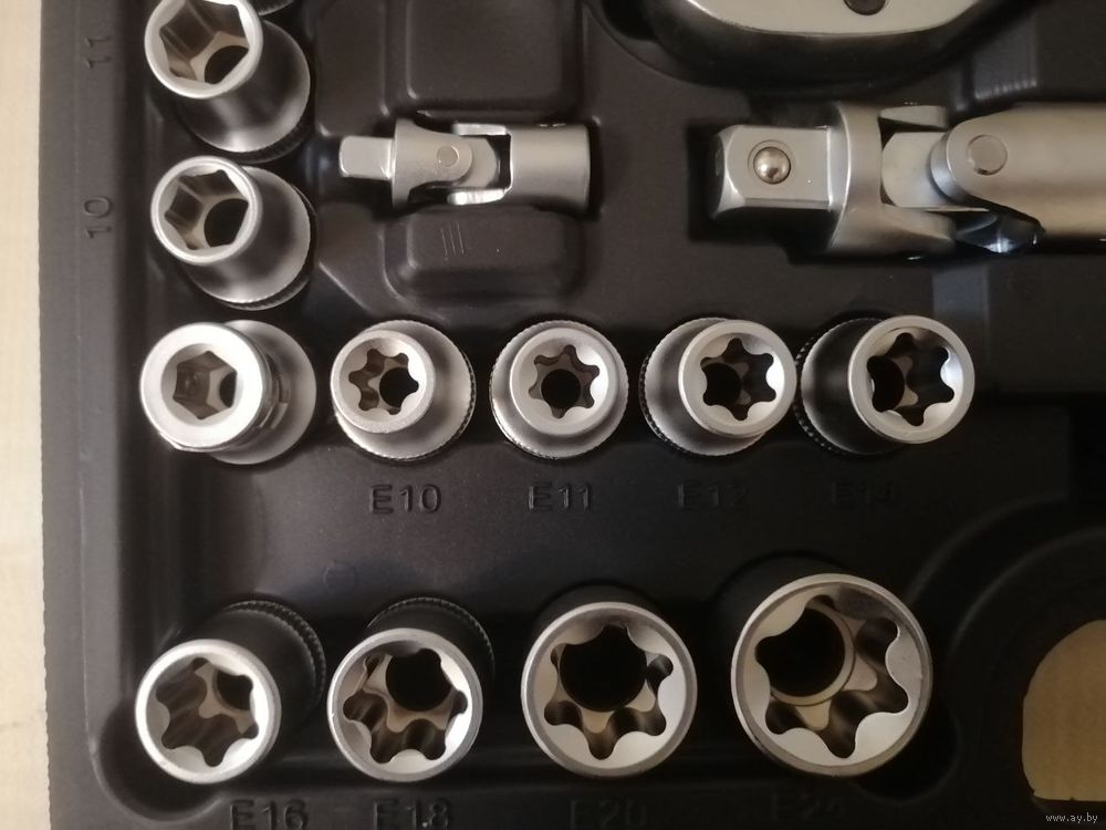 Хромованадиевая сталь. Новый. Трещотки крепкие c надежной фиксацией головок. Головки крепкие. Металлические замки кейса.Состав набора: