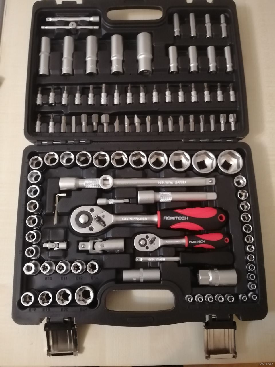 Ключ трещоточный реверсивный1/2; головки 6-гр1/2:10,11,12,13,14,15,16,17,18,19,20,21,22,24,27,30,32мм; головки E-тип1/2:E10,11,12,14,16,18,20,24мм. Длинные головки 6-гр(75мм)1/2:14,15,17,19,22мм. Адаптер-переходник1/2; Удлинитель1/2(125мм); Удлинитель1/2(250мм); Карданный шарнир1/2; Головки свечные1/2:16,21мм; Ключ трещоточный реверсивный1/4; Торцевых головок 6-гр1/4: 4,4.5,5,5.5,6,7,8,9,10,11,12,13,14мм; Торцевые головки 6-грE-тип1/4:E4,5,6,7,8мм; Длинные торцевые головки 6-гр(50мм)1/4:6,7,8,9,10,11,12,13мм; 2 удлинителя1/4:50мм,100мм; Отверточная рукоятка1/4(150мм); Вороток Т-образный1/4(110мм); Карданный шарнир1/4; Адаптер для бит1/4; Биты5/16(HEX):7,8,10,12,14мм; биты5/16(TORX):Т40,45,50,55,60; биты5/16(SL):8,10,12мм; биты5/16(PH):З;4; биты5/16(POZI):РZ3;4;Головки с битами1/4(HEX):3,4,5,6мм; Головки с битами1/4(TORX):T8,10,15,20,25,27,ЗО; Головки с битами1/4(SL):4,5.5,6.5мм; Головки с битами1/4(PH): PH1;2; Головки с битами1/4(PZ): PZ1;2; Ключи шестигранные:1.5,2,2.5мм; Кейс 390*285*75мм; вес 6500г