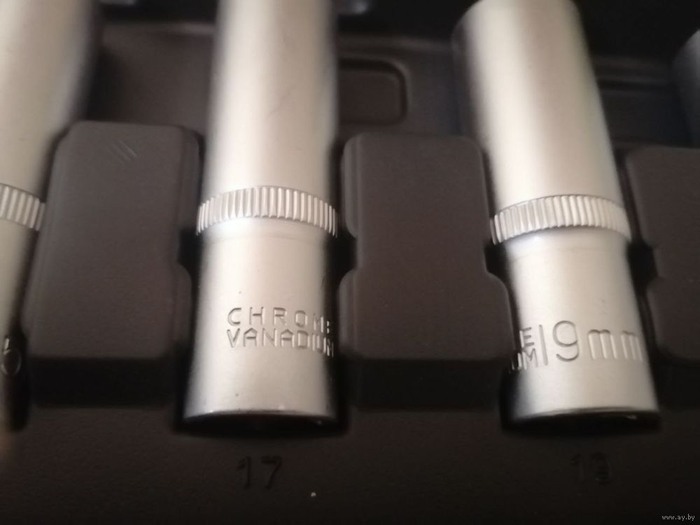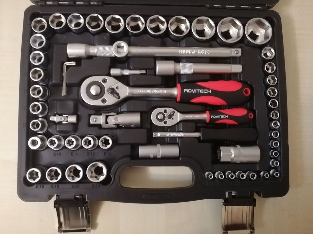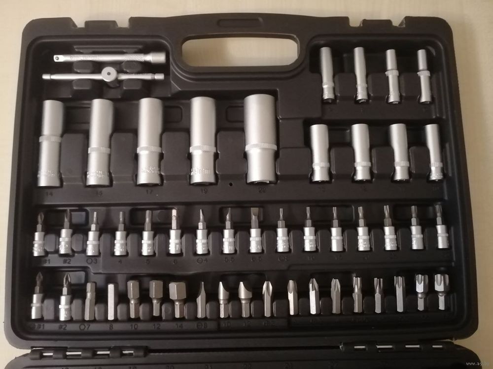 Хромованадиевая сталь. Новый. Трещотки крепкие c надежной фиксацией головок. Головки крепкие. Металлические замки кейса.Состав набора: