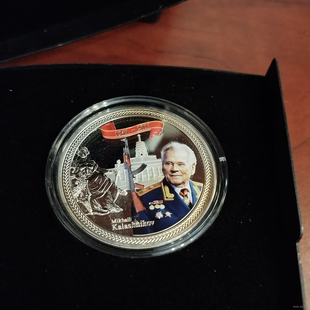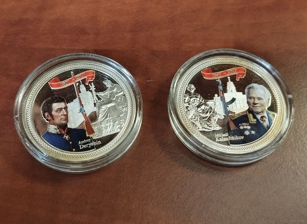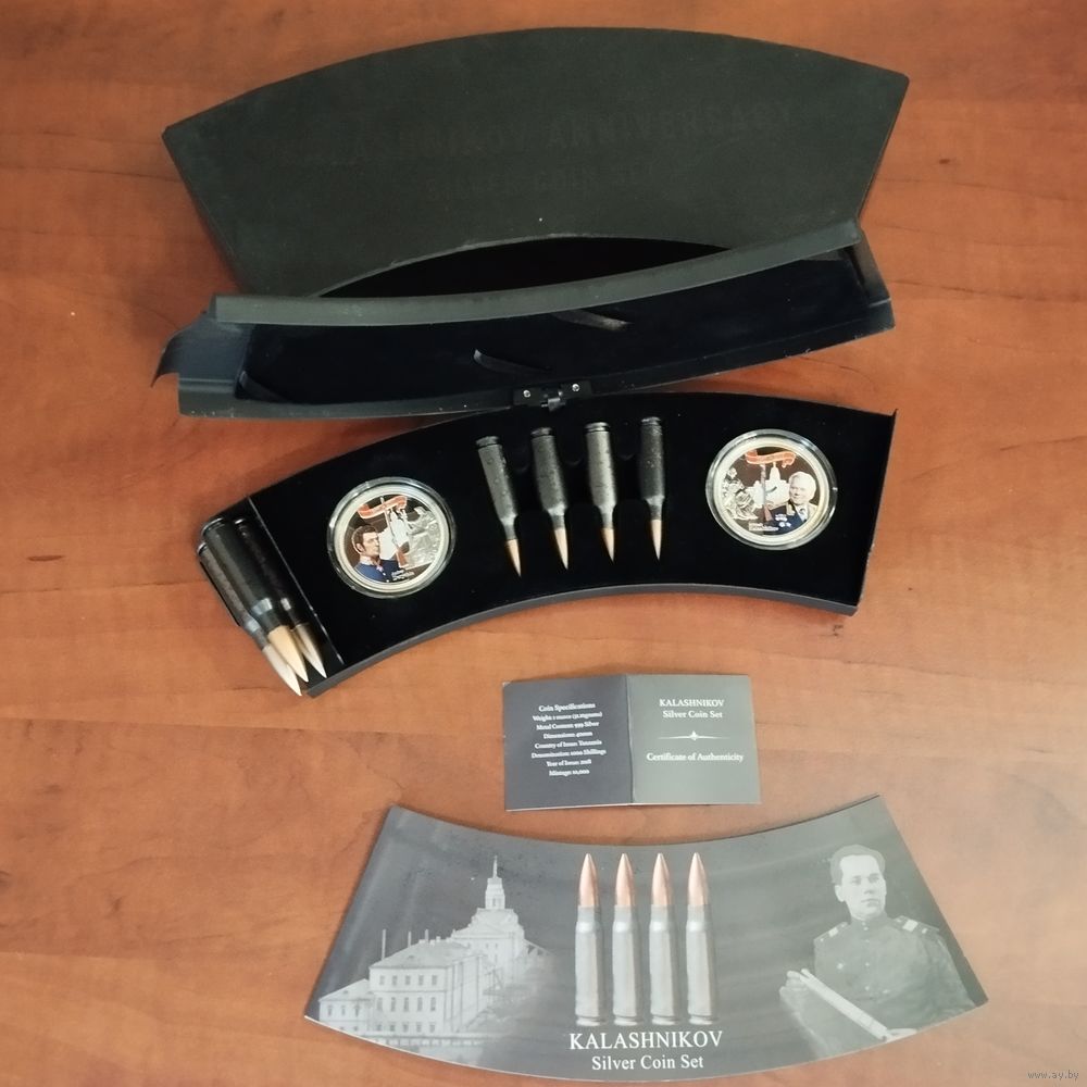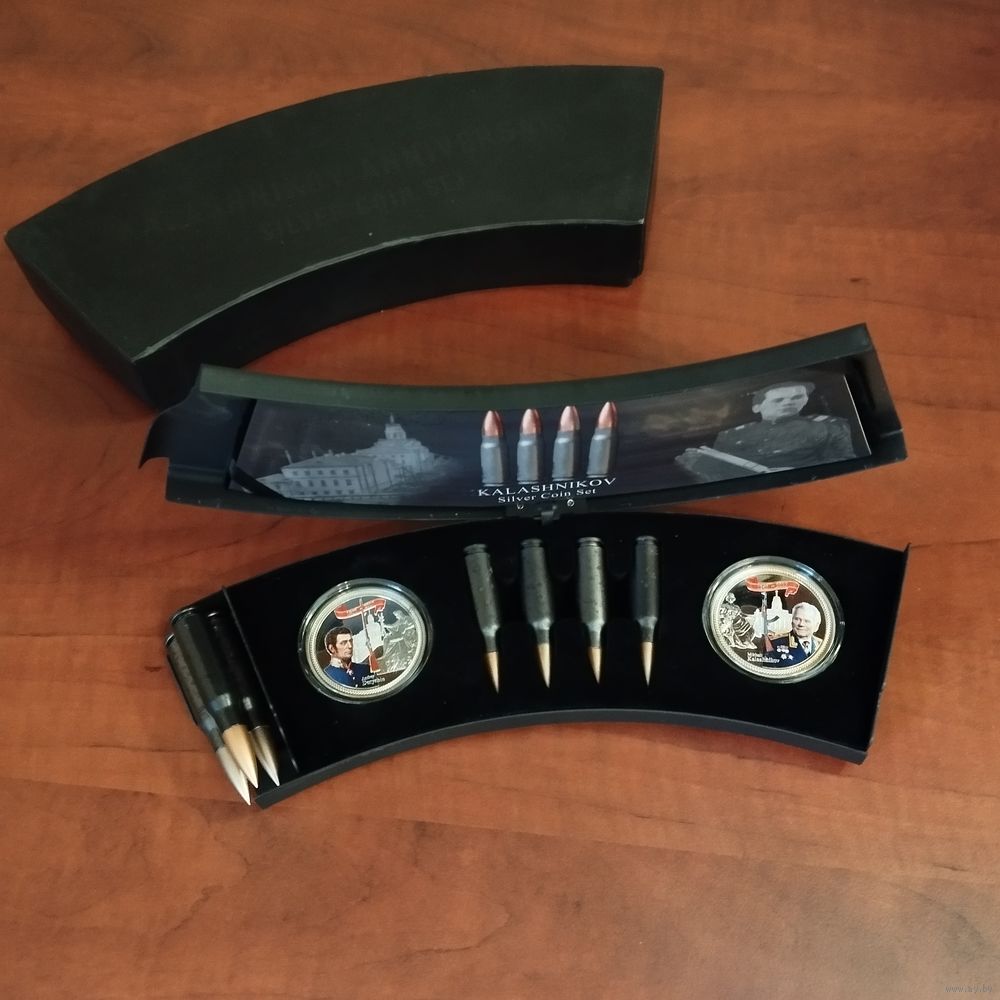 Комплектация:Монеты упакованы в подарочный демонстрационный футляр в виде прототипа автомата Калашникова по 2 шт.