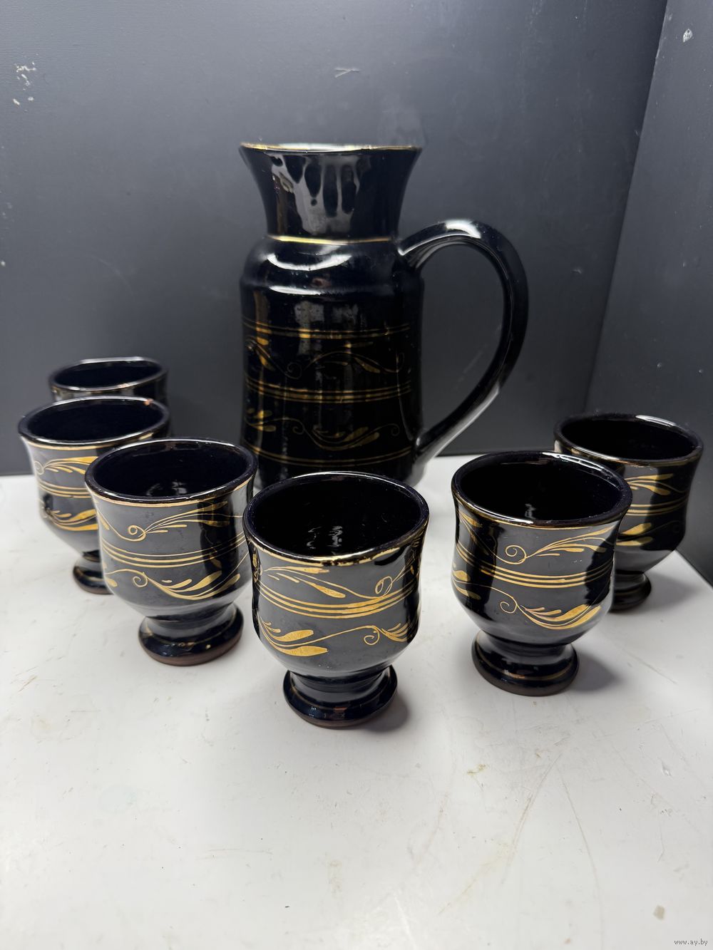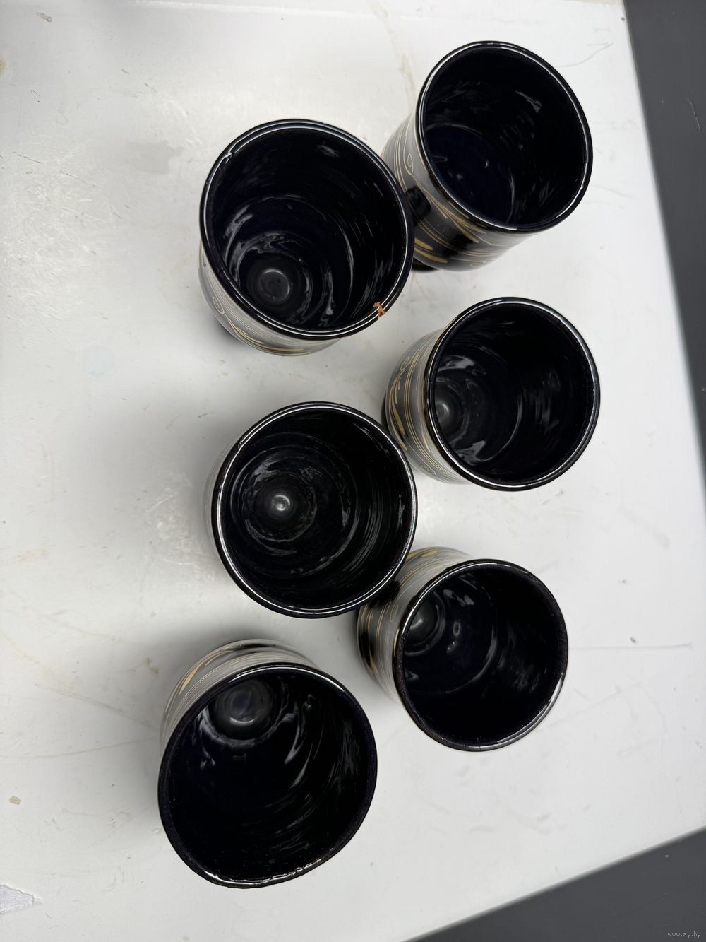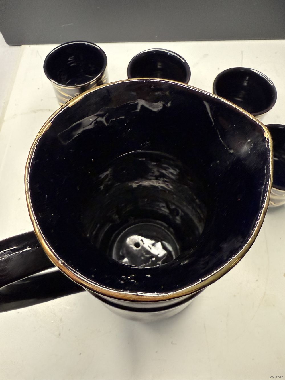 Набор из кувшина и стакана с ленточным орнаментом на чёрном фоне, керамика, роспись, золочение, СССР, 1970-1990 гг