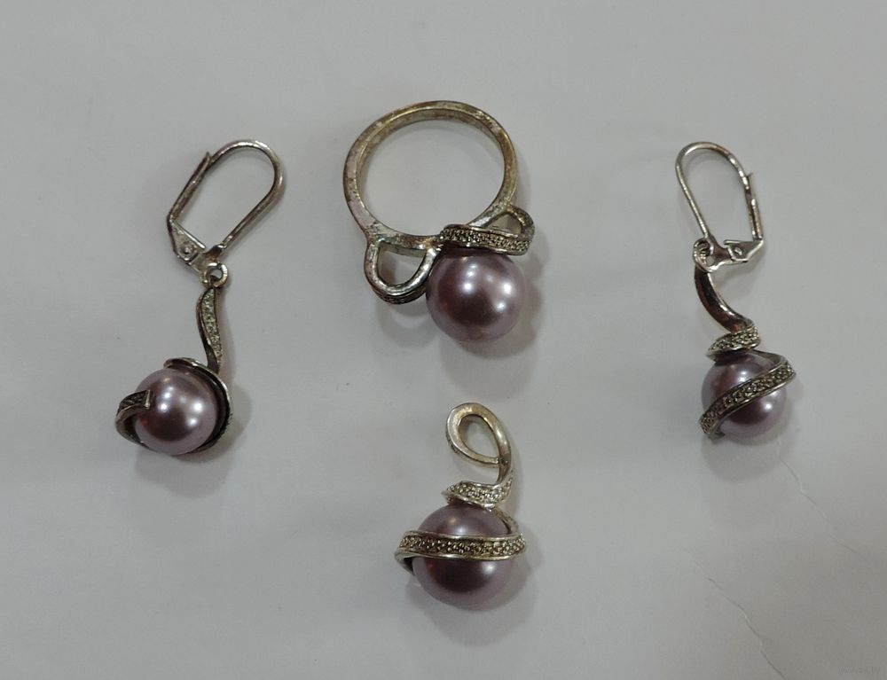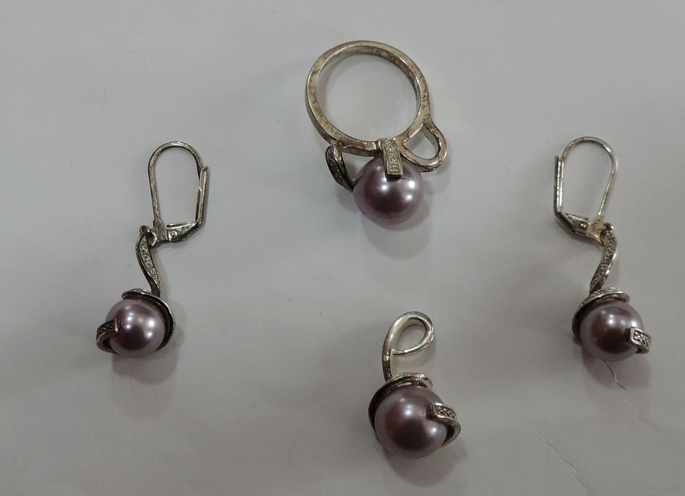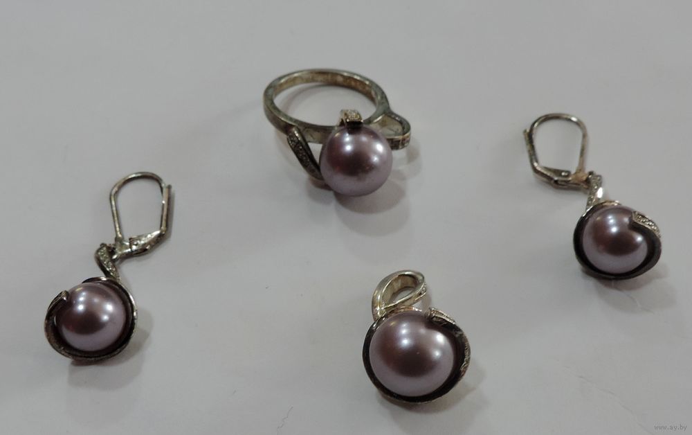 Набор - Кольцо (перстень) размер 1.8 см. Серьги (размер 1.3-3.3 см.), кулон (размер на 2.5 см.) Искусственный жемчуг с перламутровым блеском.