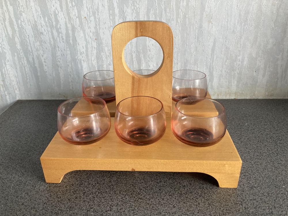 95/ Размер подставки 170х155х130 мм Размер рюмки диаметр 40 мм, высота 45 мм. Стекло вишневого цвета.